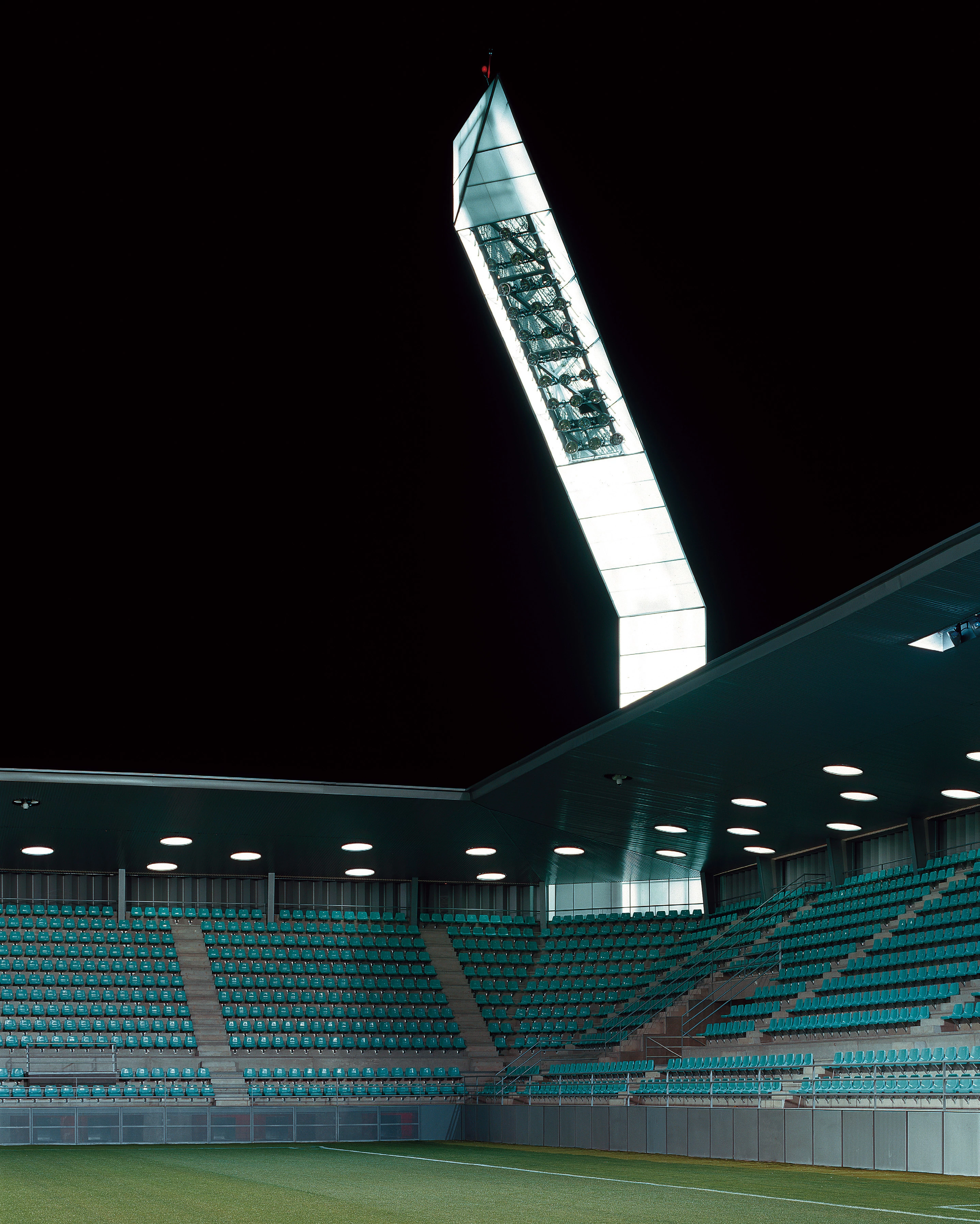 The prefab concrete grandstands support the auxiliary structure of a perforated sheet enclosure that wraps up the upper levels. The lighting towers are covered by a double ayer of translucent resin.