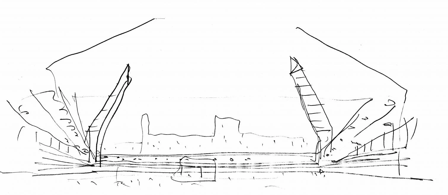 The distribution of the public accesses from the street is a particularly important part of the design. The main ones, formed by gently sloping ramps, are tucked into the corners; the rest are around the full façade.