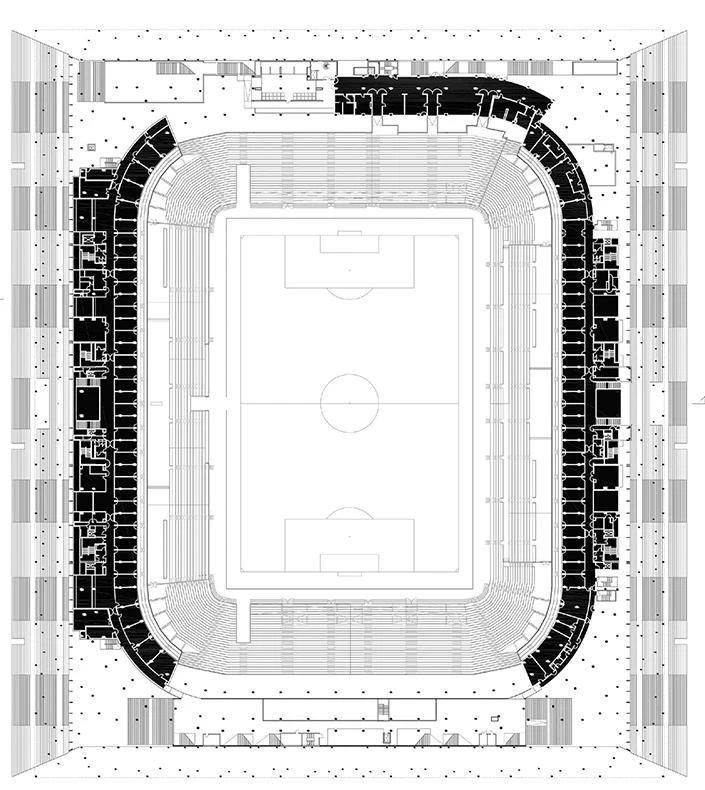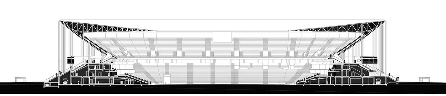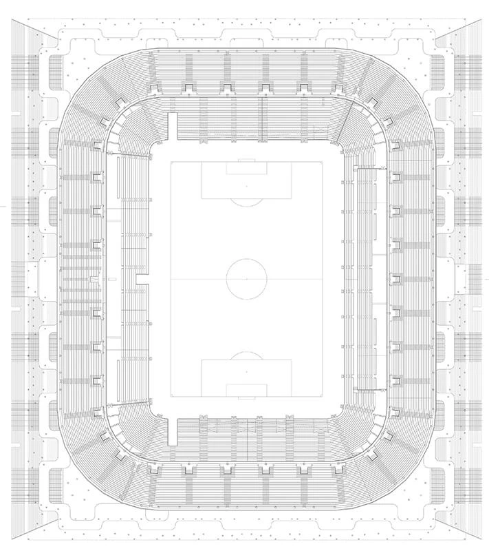 Although the image that triggers the project – a forest of columns – is metaphorical, the building is a rigorous functional exercise that is to accommodate 42,000 spectators under the best possible visibilility conditions. With this as the objective, between the playing field at ground level and the level of the exterior entrance is a wedge-shaped volume that contains the entire program, from mechanical installations to the VIP room. The geometry of this wedged construction is determined, on the outside, by the section of the stairs, while on the inside it adapts to the slope of the grandstand. This arrangement breaks with the traditional scheme of stadiums: instead of circulating through flights of stairs or ramps, the crowds climb some exterior steps until they are halfway up the grandstand. Since from this point one has a panoptical view of the stadium, it is impossible to get to the lower or higher tiers, which are at the same distance, without experiencing orientation difficulties.