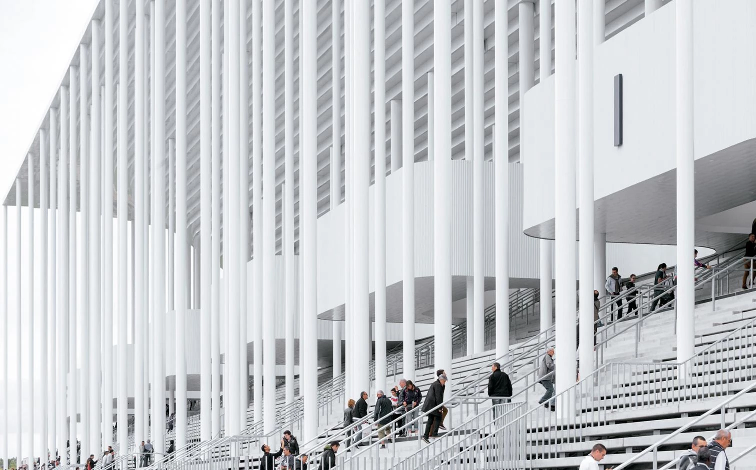 As in a classical temple, a curtain of columns on a plinth rises on the plain of Bordeaux. But unlike ancient temples, this stadium turns its podium into a very emphatic stairway, and the result is a blurring of the lines between interior and exterior, and the entire building looks lightweight.