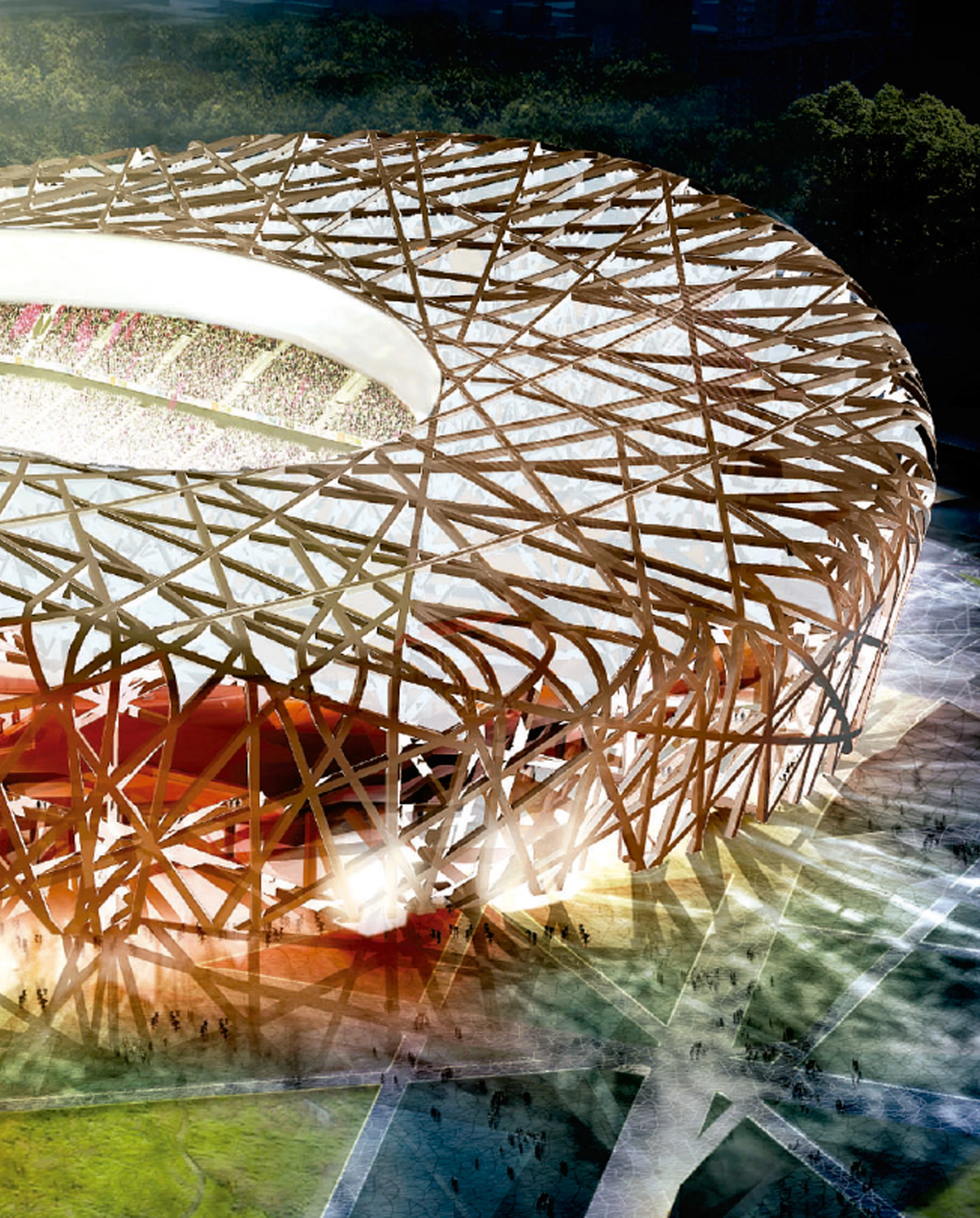 Herzog & de MeuronThe new National Stadium is located on a gentle rise in the center of the Olympic complex. It is conceived as a large collective vessel. The stadium’s appearance is pure structure. Facade and structure are identical. The structural elements mutually support each other and converge into a grid-like formation, almost like a bird’s nest with its interwoven twigs, in which facades, stairs and the roof are integrated. The spatial effect of the stadium is novel and radical and yet simple and of an almost archaic immediacy, thus creating a unique historical landmark for the Olympics 2008.