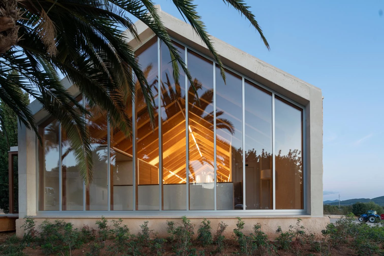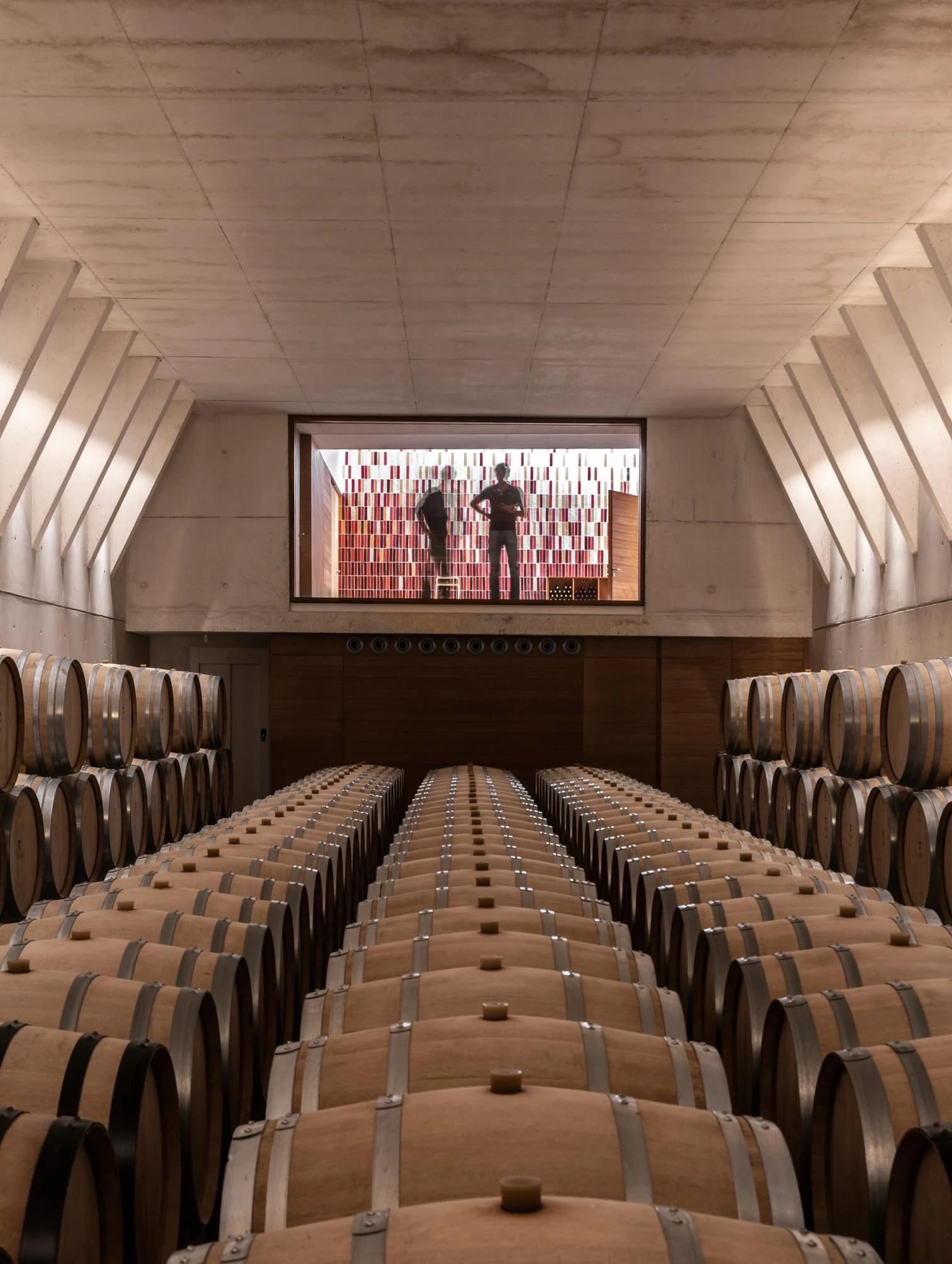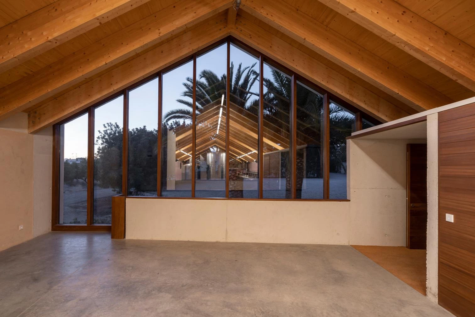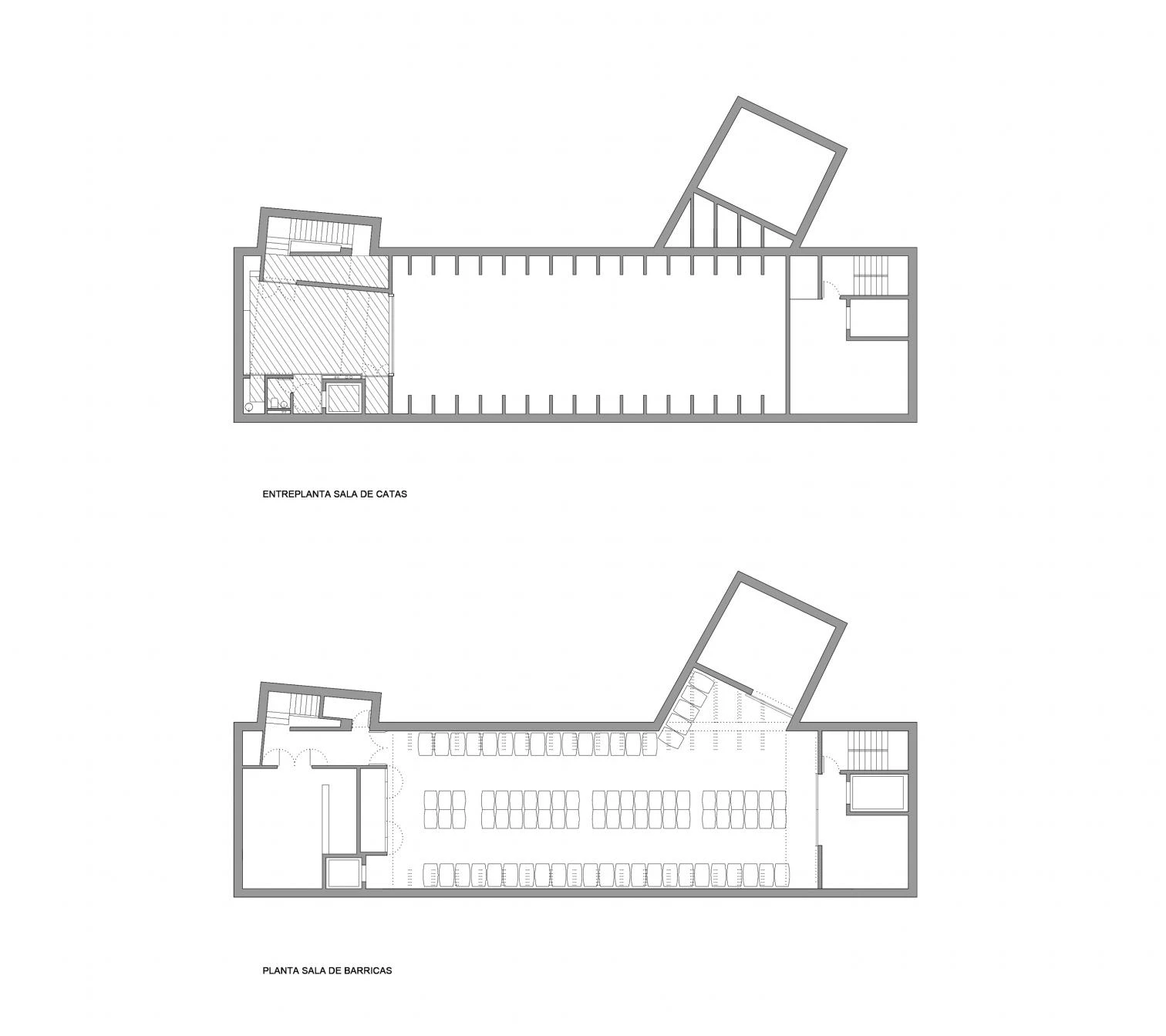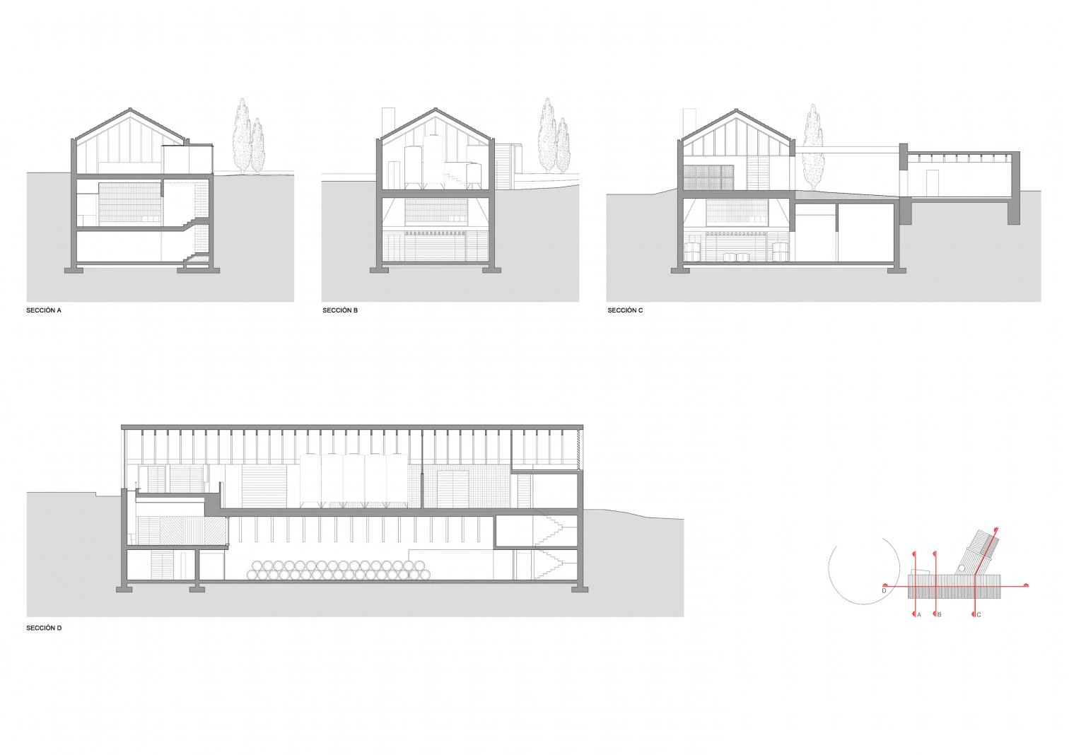 The structure proposed is a diaphanous shed with a gabled roof clad in Arabian tiles, not very different in size from the existing storage room. Above grade, part of the warehouse is used to store wine bottles and the bottling plant, and the other part is for winemaking. The entrance and the new reception area placed at the northern end and the tasting room, a space bathed by natural light, is one level below. A glass surface stretches from wall to wall covering the barrel halls, executed with reinforced concrete and completely buried to maintain optimum temperature and humidity.