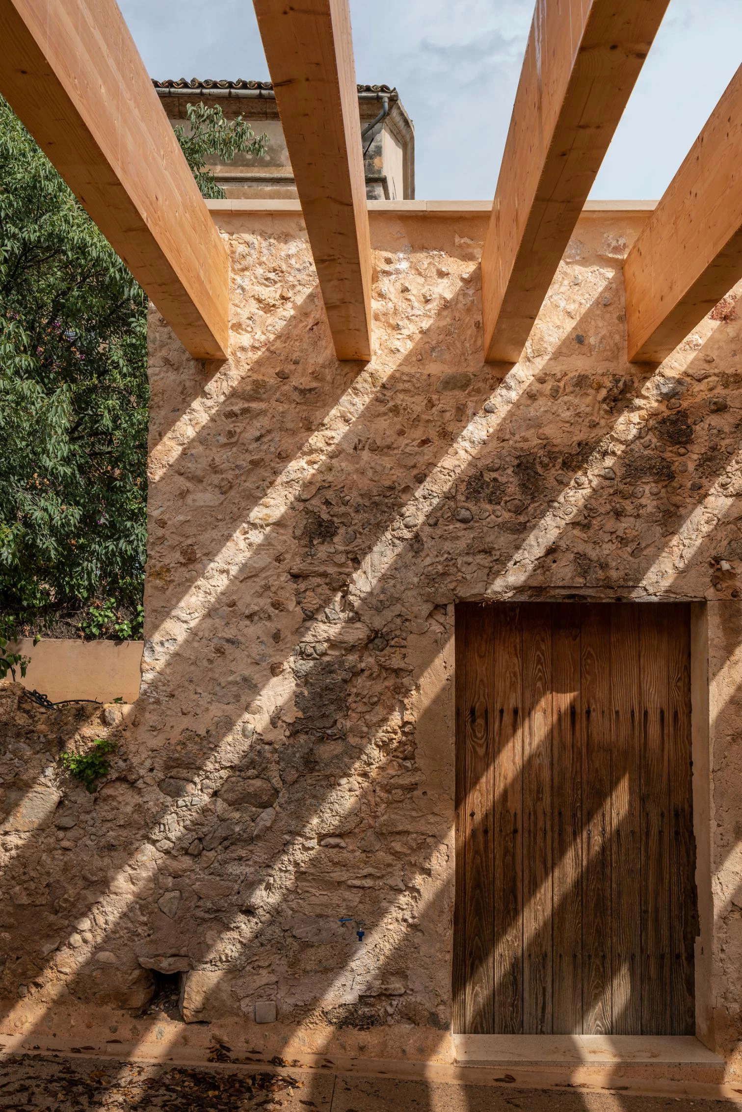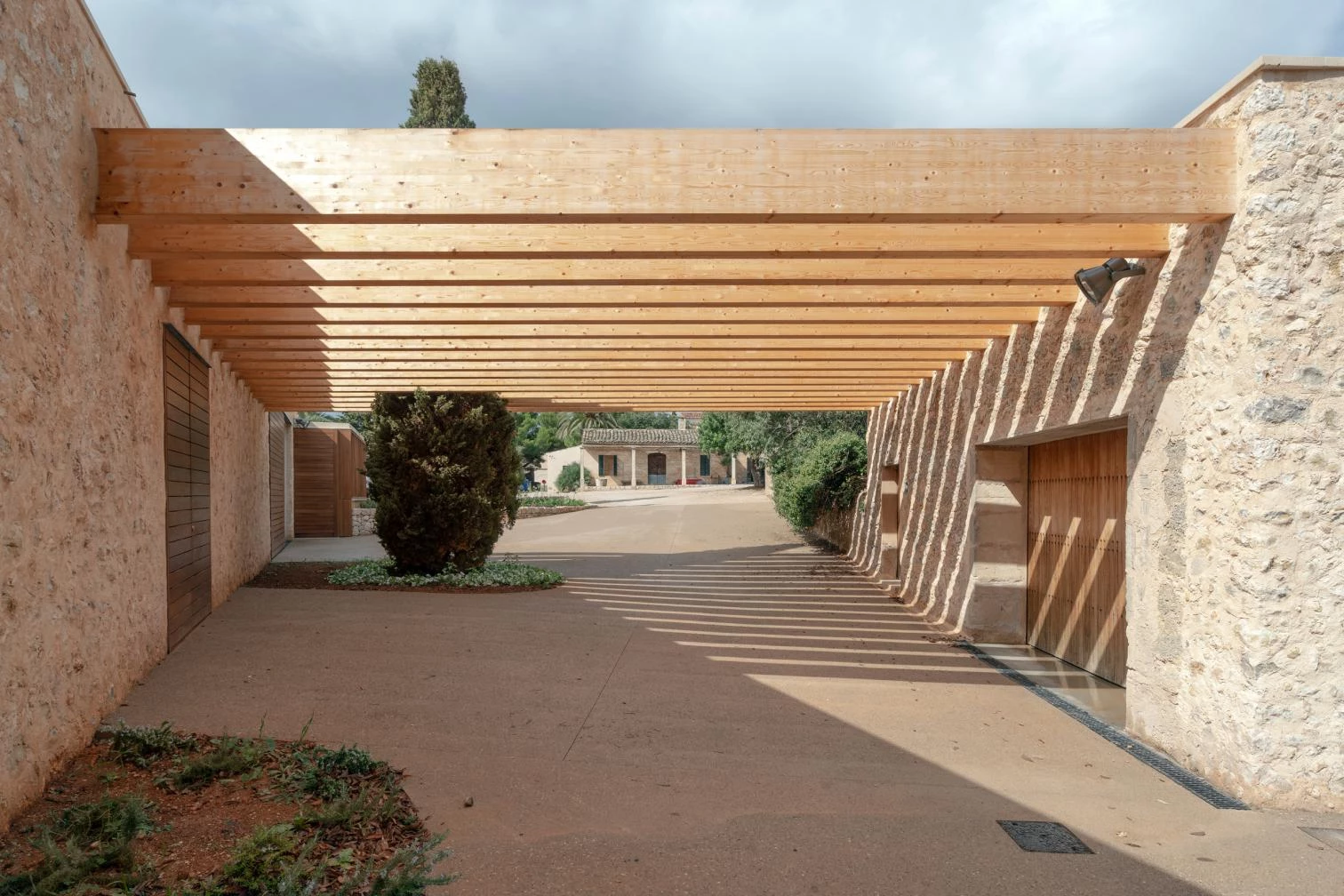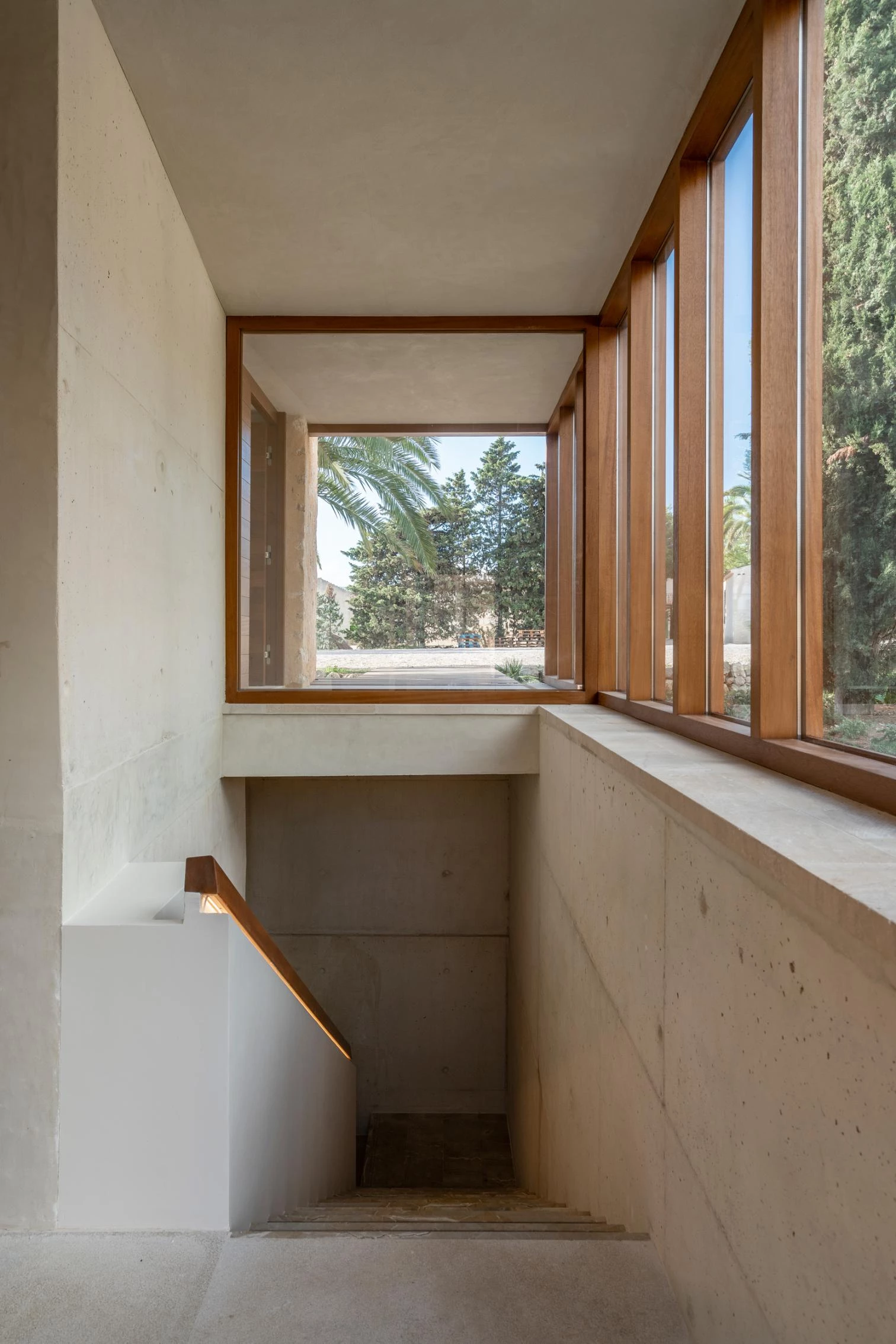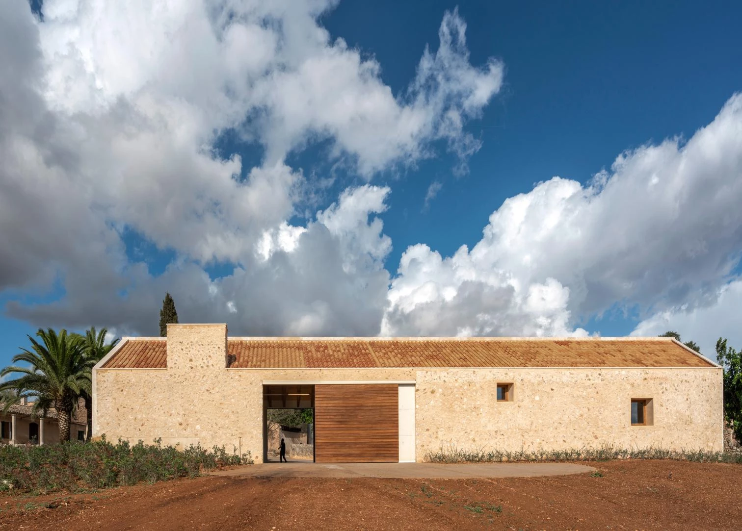 While the exterior recovers traditional masonry techniques to echo the other buildings, the interiors present surfaces of unfaced white concrete but feature wooden claddings, colorful handcrafted tiling, and Binissalem marble floor slabs.
