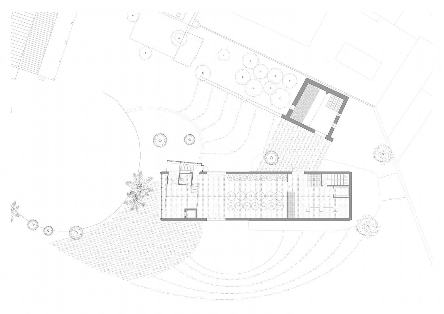 Integrated in the complex, the extension is designed as a strategy to reorganize the plot, actually resting on top of a preexisting construction, giving new life to spaces that used to be residual and keeping all the trees, which stand out with the new arrangement. The addition’s form and location on the new west border provides a facade in this part of the complex where there are no listed buildings, creating a courtyard-like space in the interior of the plot around which the winery’s activity is articulated.