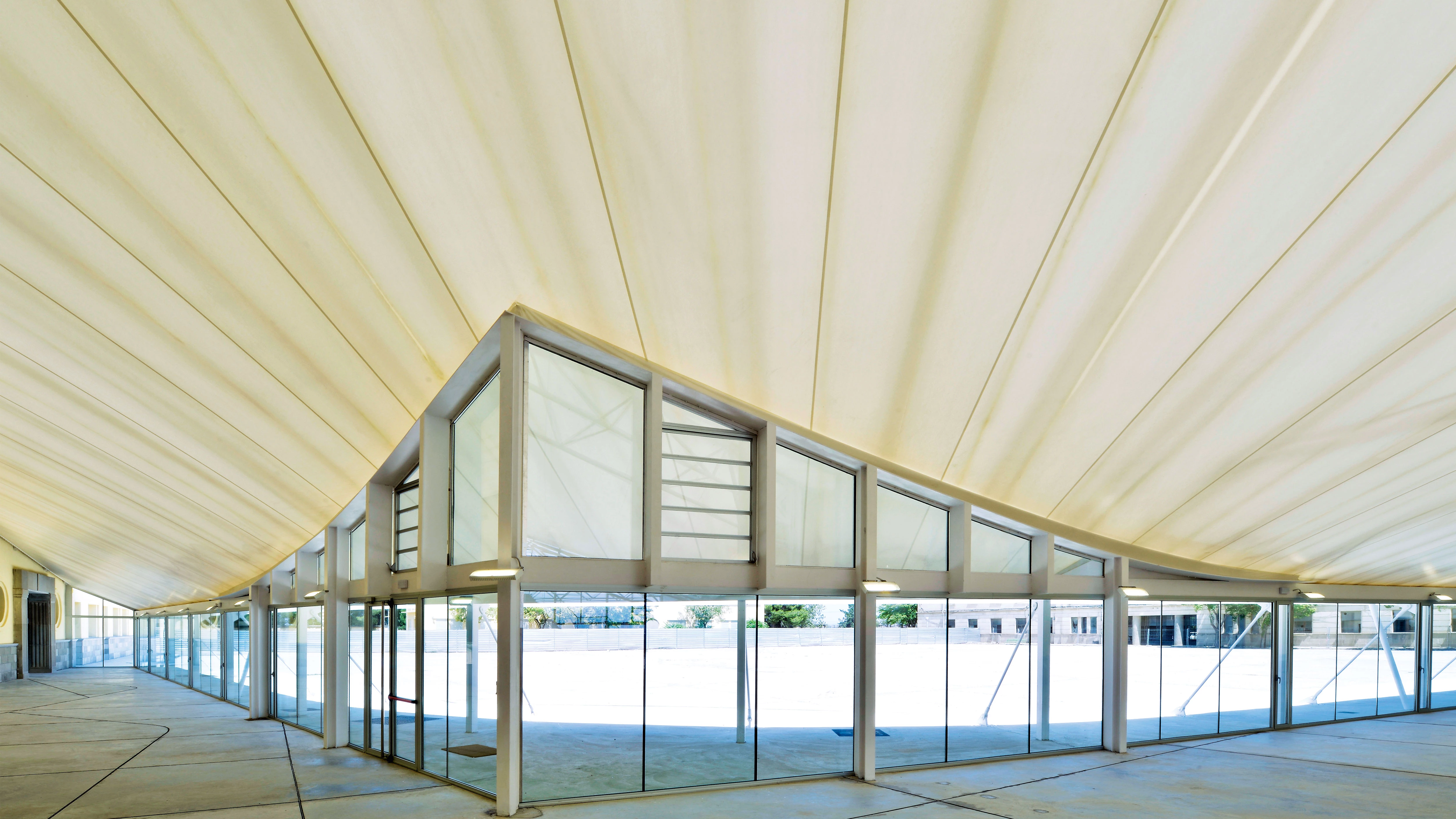 This envelope is formed by textile canvases fixed to a substructure of steel tubes and struts arranged in accordance with a geometry of curved lines. Each compression ring of the subframe is slightly shifted with respect to the one under it, in such a way that the canvases, tautened between stretches, become complex warped surfaces which, besides producing a suggestive chiaroscuro effect, protects the building’s inner layer against excessive solar radiation, thus performing bioclimate functions in the summer.