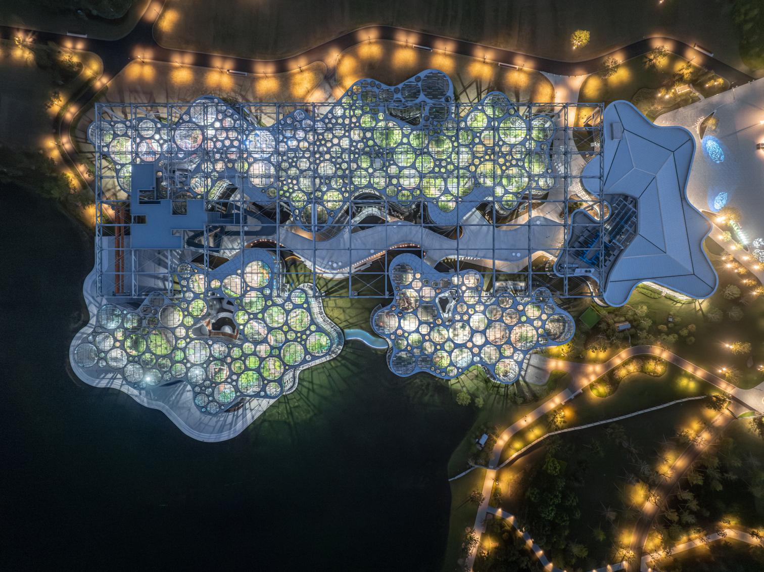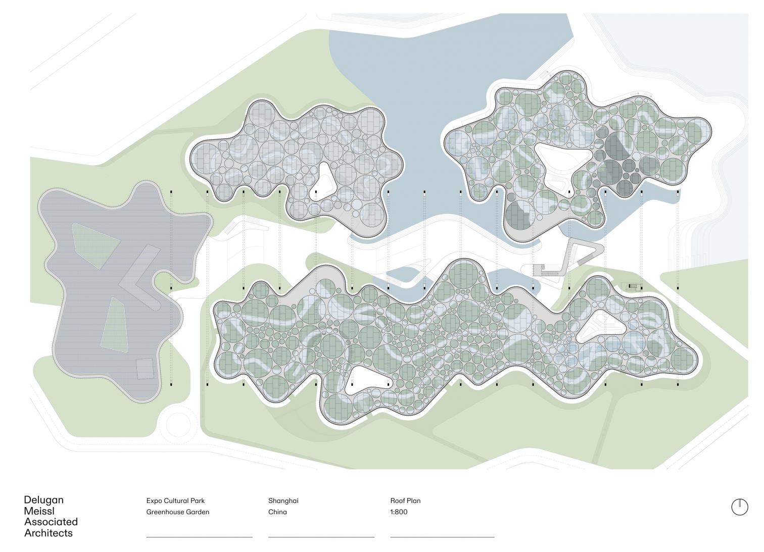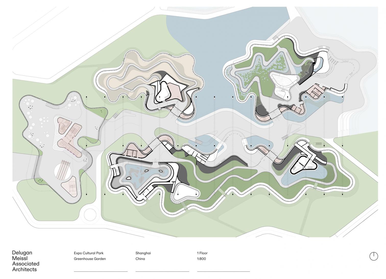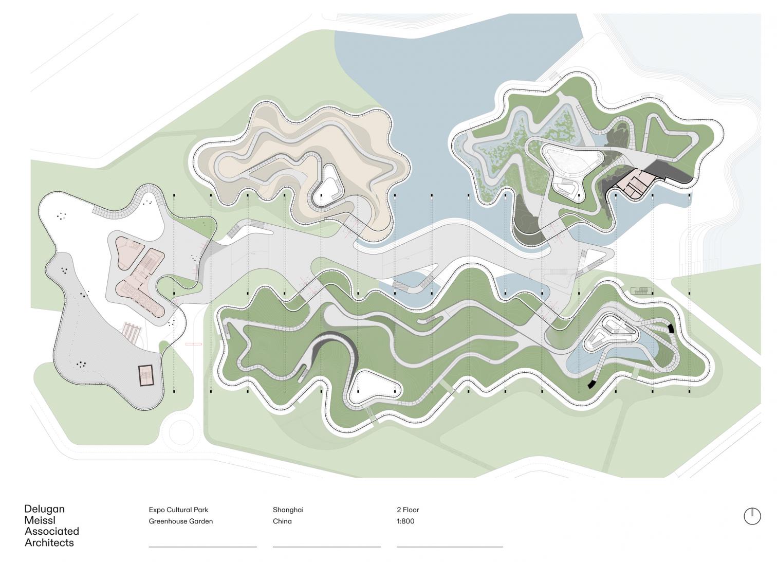 Under the geometric steel structure of the industrial construction, the greenhouse is composed of an entrance building and three pavilions set in different climates, all of them organically curving. The first one recreates the aridity of a desert; the second, the humidity and biodiversity of the tropical rainforest; and the third, a flower garden that doubles as a venue for traveling exhibitions. Visitors follow the winding pathsways between pavilions and go up to a terrace for overviews of the surroundings.