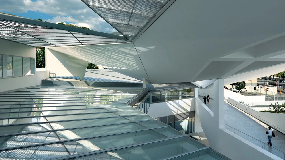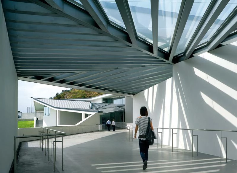It also has an assembly hall for 350 people, and other smaller halls, one for 50 people and two more for 20 people each. The center is accessed through an exterior ramp located on the main facade, protected from harsh sunlight by a series of roofs that filter the entry of light. The roofs assert their unitary presence with different folds and projections that perform as canopies over the facade, generating a sheltered area upon which a gardened space extends.
