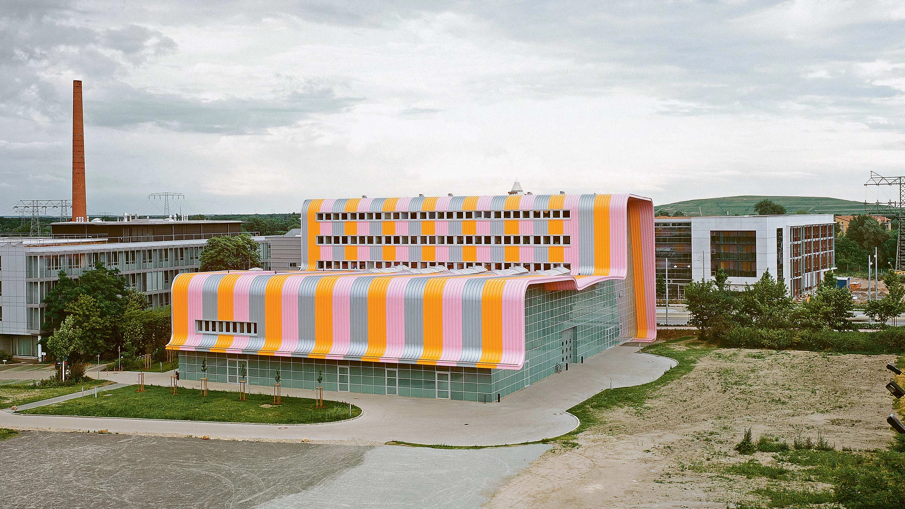 The scientist Otto von Guericke proved in 1657 the existence of the void, and more than four hundred years later the city became an important industrial hub in East Germany. Within this innovative tradition, the Experimental Factory Magdeburg is a research institution for a range of disciplines, providing spaces for offices and laboratories as well as a large hall for mock-ups of all kinds. The building comprises a compact combination of three differing volumes: a large five-storey structure to the east – facing the highway –, houses offices and laboratories; the second one is a single volume of variable height (between 7 and 10 meters) for large-scale experiments; and the third, on the west, is a testing-space for electromagnetic fields. A double-height atrium and a gallery connect all the spaces. These three elements are enveloped into an urban blanket with orange, pink, and silver stripes, which unifies them visually in a single compact volume, providing as well good thermal behavior and adequate insulation. The facades to the south and north are made of translucent glass so as to address the Experimental Factory’s respective neighbors, while the facade blanket drapes over the east and west sides...[+][+]