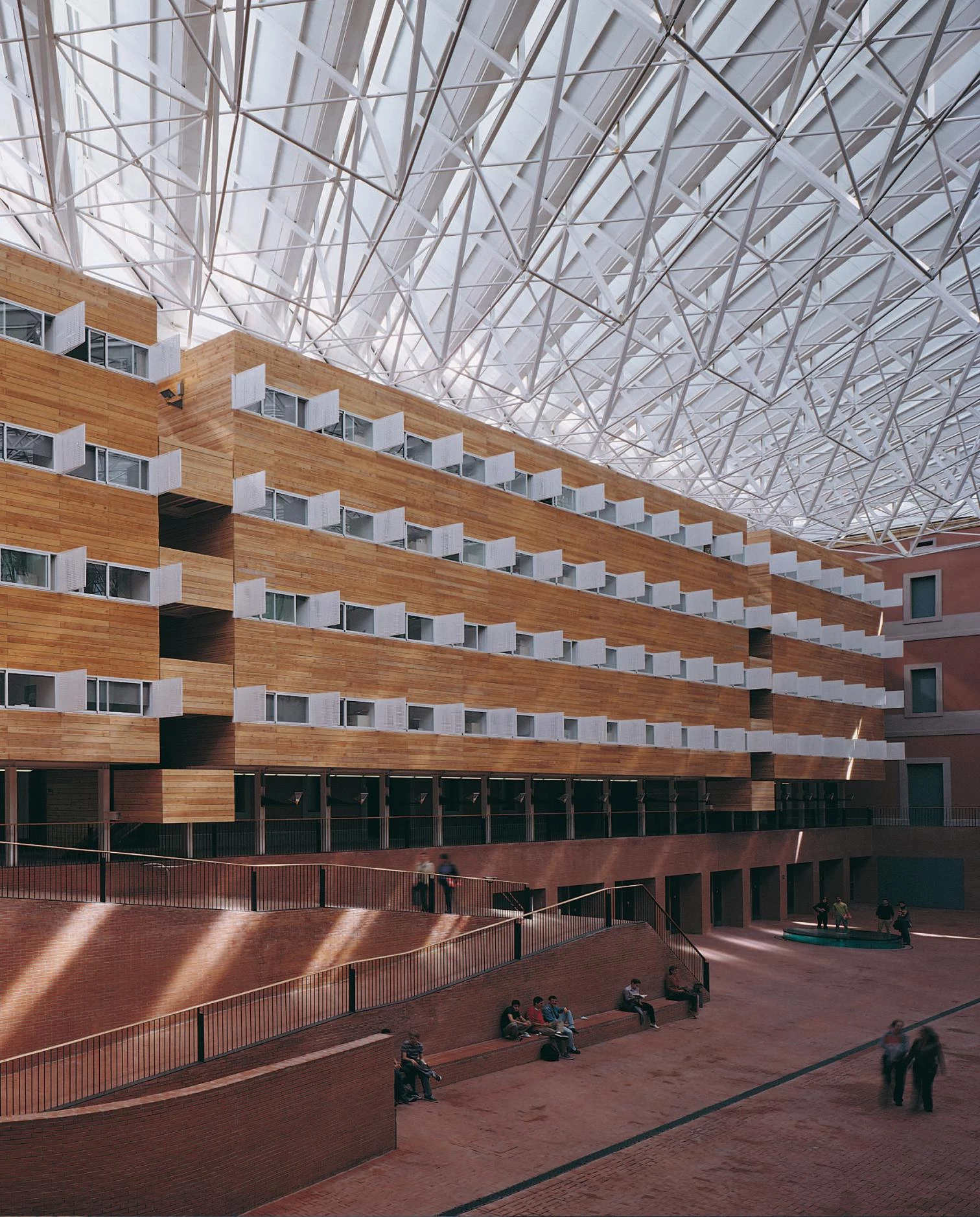 The classrooms are grouped in a glazed prism that faces the wooden volume which houses the professor’s offices; the windows on the other two atrium facades correspond to the ring corridor.