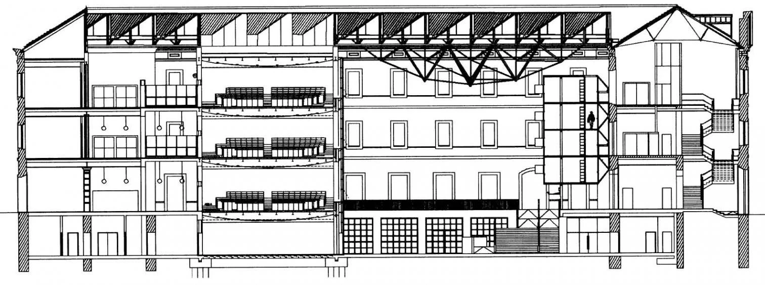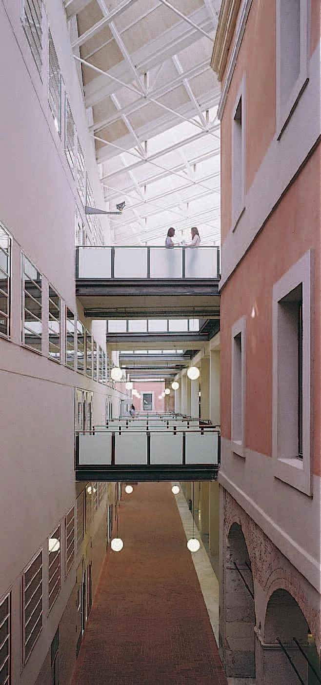 The Roger de Llúria barracks were built by military engineers in 1879 on one of the first blocks of the Ensanche, following the guidelines proposed by Cerdá. A passage divides the block into a linear volume housing the dwellings and the barracks organized around several courtyards. To adapt the latter building to academic purposes, a few volumes among courtyards were removed, maintaining only the perimetral bay. The program initially foreseen – 24 classrooms for 120 students each – was extended in the course of the project with numerous department offices, when the decision was made to transform the building into the Law School building. To fit in all these areas, two linear volumes are inserted in the block courtyard, adopting a different configuration depending on the spaces they contain. The most transparent volume is also the larger one and houses six classrooms on each of its four floors. Small catwalks connect the classrooms with the corridor that surrounds the block court. Parallel to the classroom’s volume, a narrower bay houses the offices behind a closed facade that confers a public space character to the atrium. A series of diagonally arranged skylights cover the central void to protect this meeting point from rain.