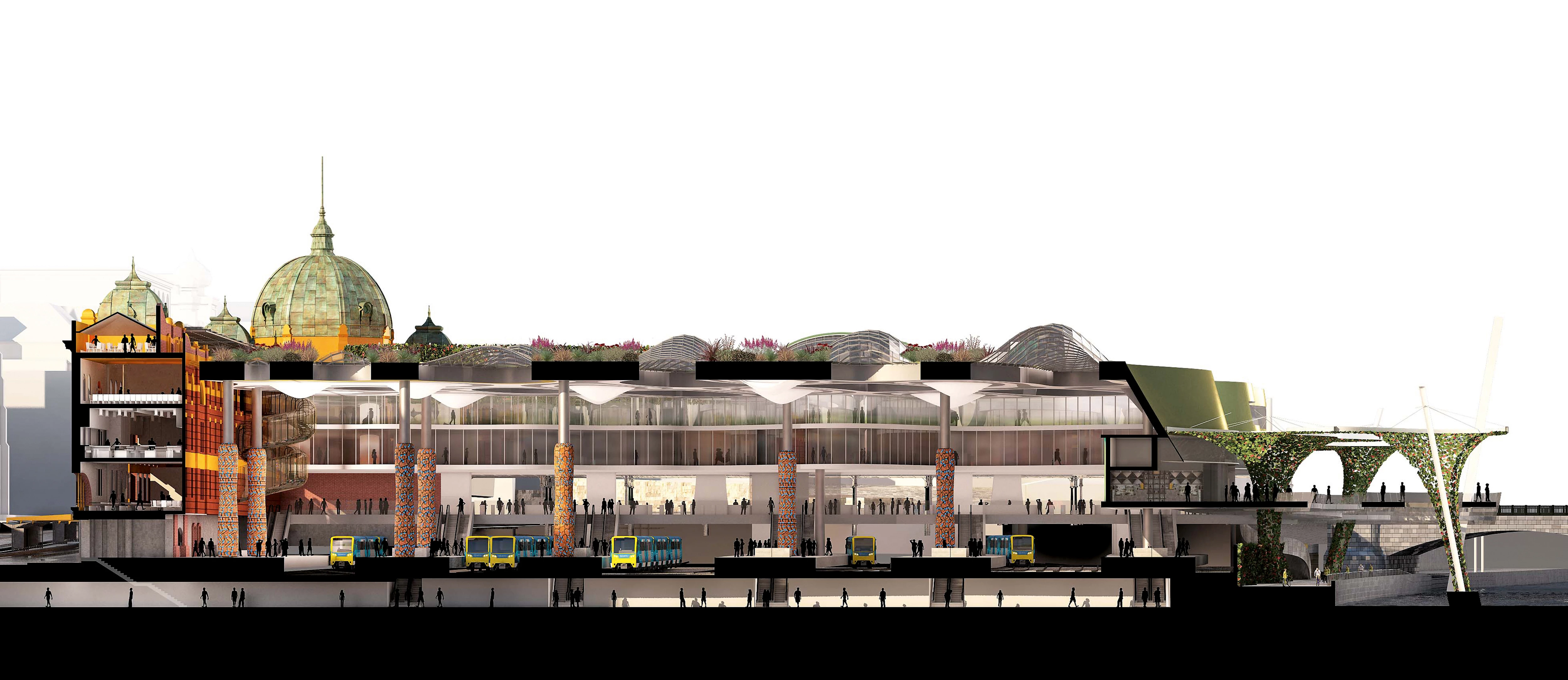 The reflection and the spreading of waves and curves is the metaphor that inspires the project, which includes a large rooftop garden made up of a great diversity of vegetation and sparse ‘islands’ that function as skylights of the new station.