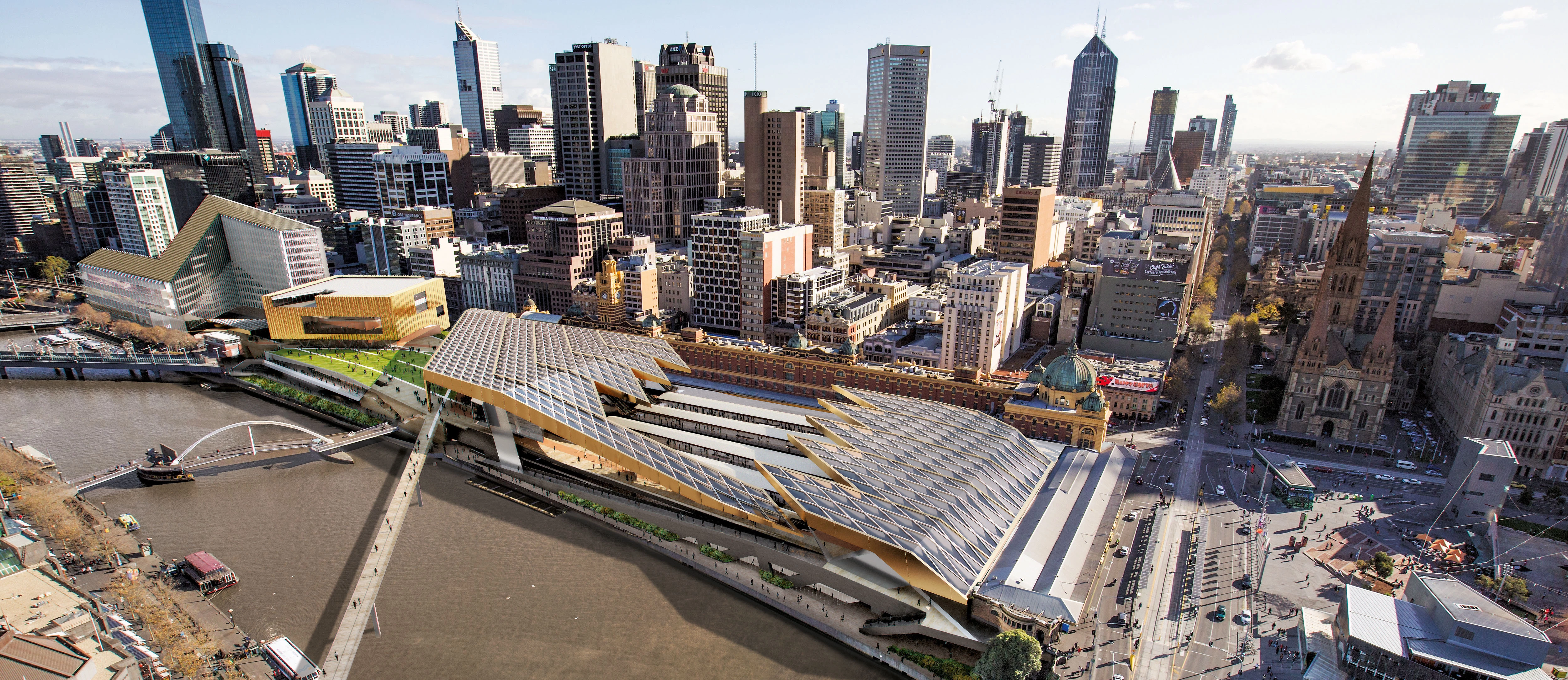 Wishing to offer new civic spaces, the proposal incorporates a large cultural building – the Melbourne Room –, and a number of pedestrian connections under a glazed lattice that shelters the users without interrupting the views.
