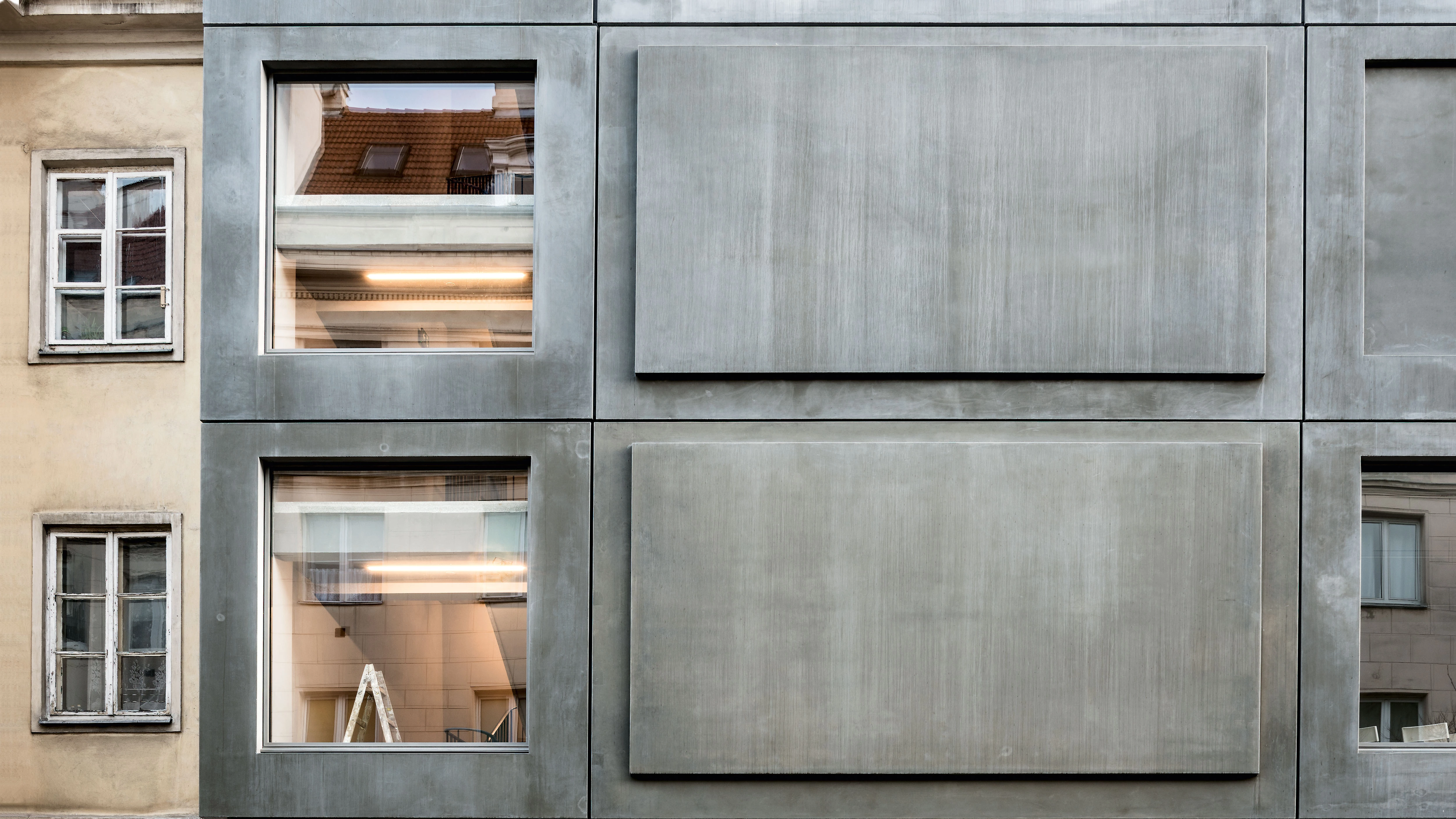 The decision to renovate the Foksal Gallery, built in the year 1963, was an answer to its need for more exhibition space. A new facade partly replaces the original one, taking up the corner of the edifice and giving it a character markedly different from that of the surrounding neoclassical constructions. Thus, instead of literally imitating them, the intervention takes the neighborhood’s historical preexistences into account, highlighting their sculptural qualities. This new external skin alternates cast concrete panels with large windows. The result is a previously inexistent dialogue between the solid elements, which define the external form of the work, and the glass panes, which make the gallery more permeable towards the city. The modular composition of the concrete surfaces reflects the continuous arrangement of the exhibition inside, in such a way that the stairs– which guide visitors from floor to floor, including the roof terrace – are visible from outside, through the large windows.