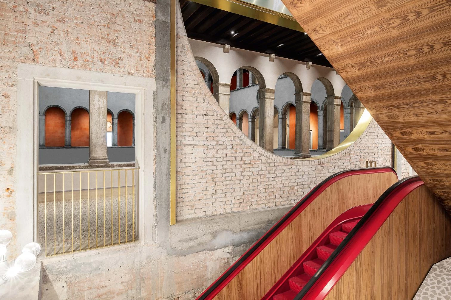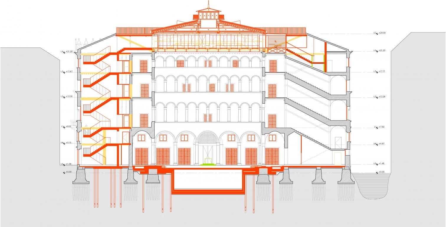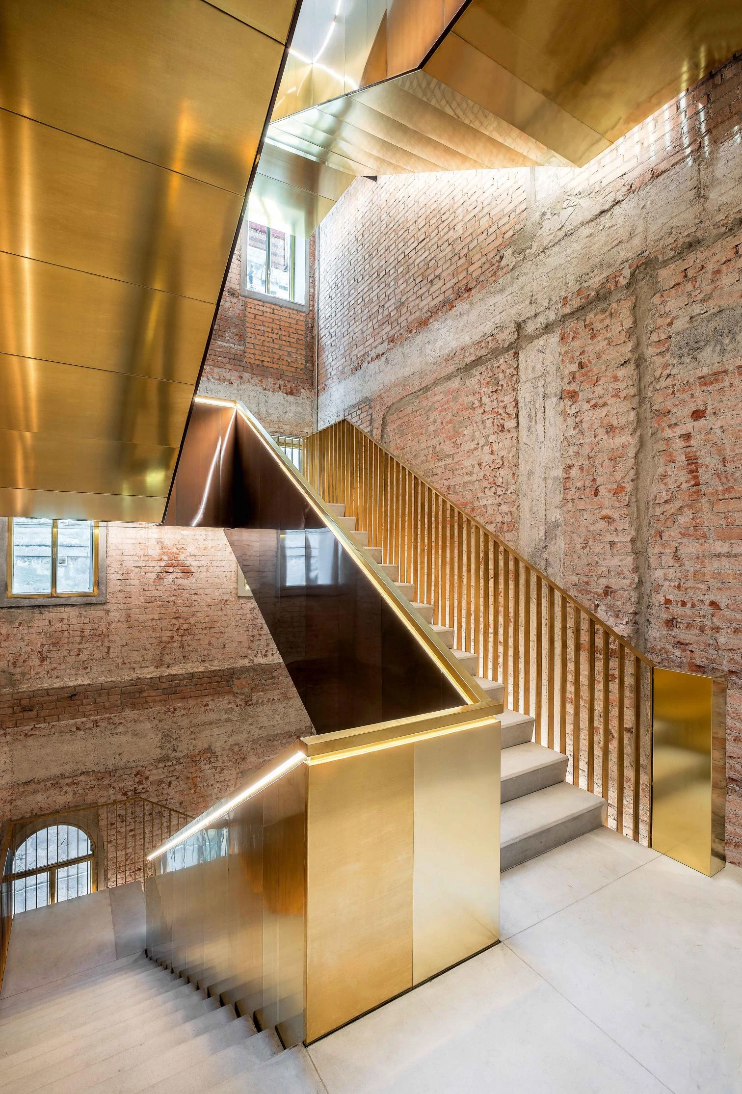 Today’s reborn Fondaco comes across as a large covered square where 15th-century walls coexist with 19th-century brickwork and bulky 20th-century structured concrete structures. Visitors enter it the way an archaeologist does an excavation site, finding themselves surrounded with all the layers of different civilizations exposed didactically, one atop another, one beside another. Notable as exceptions are two complementary features:a skylight replacing and including the 20th-century roof (now a camera segreta used as an events venue); and the red-painted escalators. While the former evokes the classical neutrality of Mies, the latter belongs to the family of ascent-and-descent elements so typical of the language of Koolhaas, evolved directly from those at the Ruhr Museum in Essen (Germany).