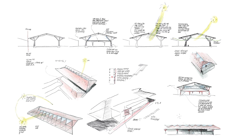 The original estate was planned as an entire farming village, with the chateau surrounded by all of the industrial facilities needed for wine-making. A new building for the production of primarily white wine extends from the eastern wing of the existing winery complex, balancing the overall composition. The first step was to create a large open space under a big roof to shelter the conveyors during the harvest season. For the rest of the year this space can be used for events, and also becomes a new entrance. The rest of the roof shelters the technical, office and social spaces, and includes a new research and development centre. In its simplicity, the new building reinterprets the form of the existing industrial facilities, retaining this connection between process and architecture. A pitched roof, covered with weathered tiles, conceals amid the traditional structures a contemporary one, supported by tree-shaped load bearing columns and punctuated by light wells. In this way, the building addresses the double challenge of fulfilling the most demanding technical requirements while respecting the existing traditional complex.
