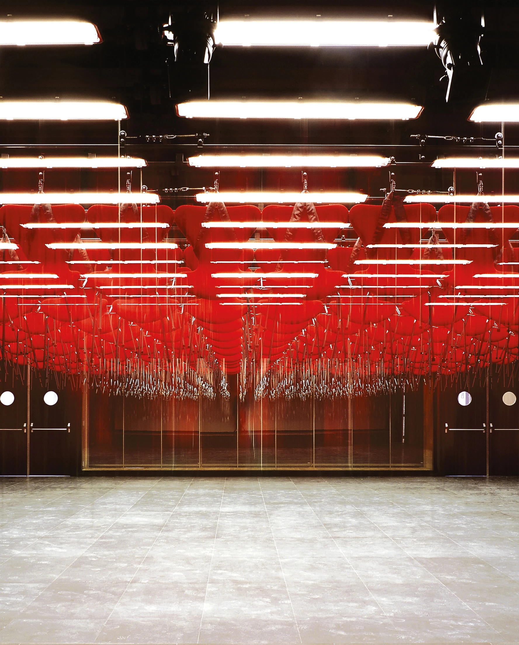 The ‘magic box’ is on the access level, the largest space of the Foundation. Its height varies from twelve to sixteen meters because the floor area is divided into sections that are raised and lowered with high-precision, synchronized hydraulic lifts. The ceiling is also equipped with harnesses that allow moving objects and lights, turning the space into a sort of stage set for the different kinds of activities that can take place throughout the day.