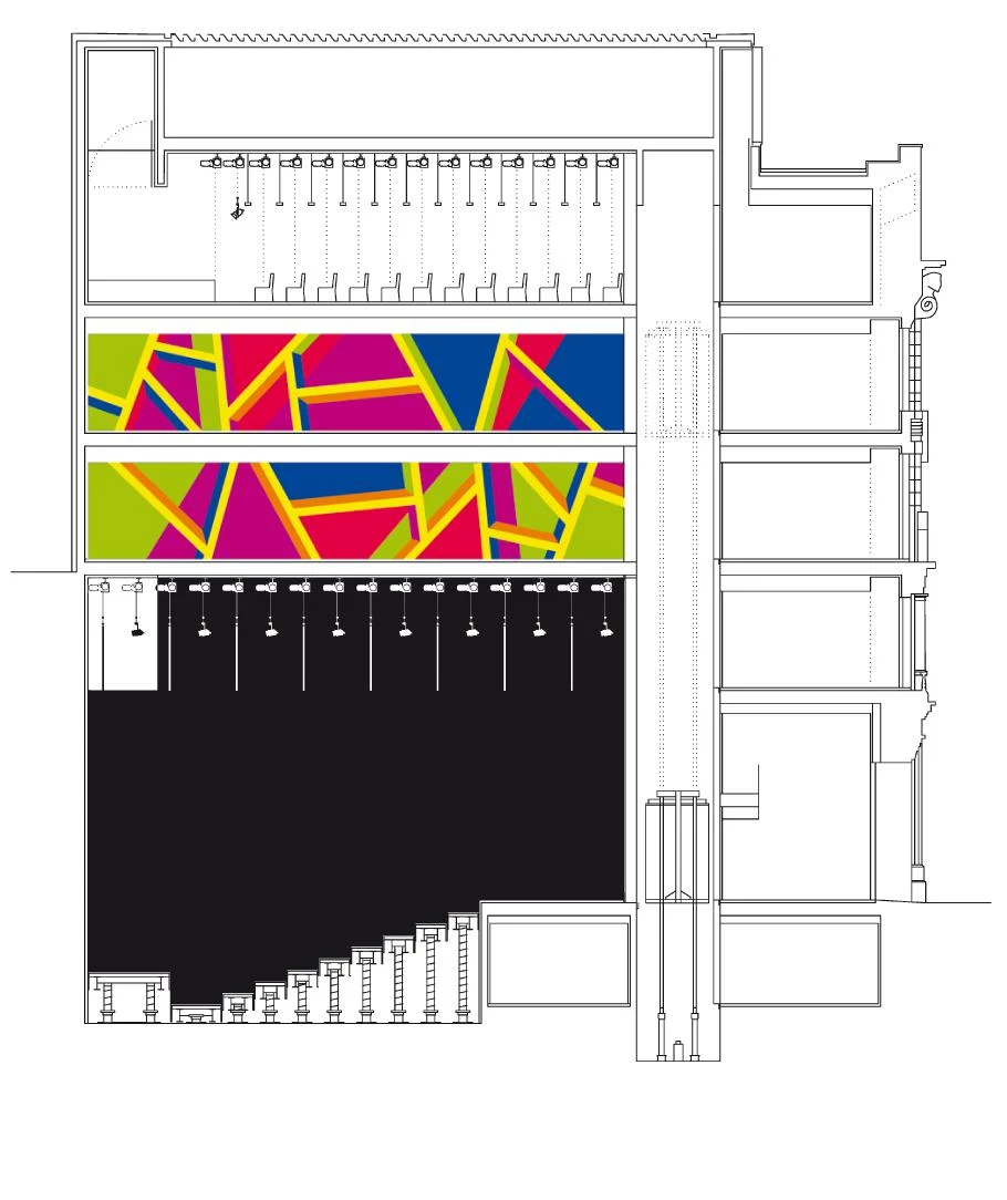 The organization of the floor plan allows to free up a regular-shape space with a side bay that houses the stairs, camerinos and services. Behind the existing facade a lobby on each floor creates an area of transition to the lifts.