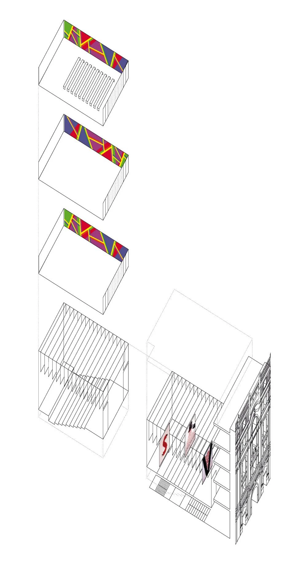 Inside, the floors are organized in two clearly differentiated bands: a bay parallel to the façade, which currently exists, and a larger body inside the block. The first centreline constitutes a threshold of respect towards the existing building, serving as a distribution space on all the floors. The interior body houses the rooms for exhibitions and various events, as well as the technical nucleus for vertical communication and installations. Between the two bodies are two large glass lifts with adjustable transparency.
