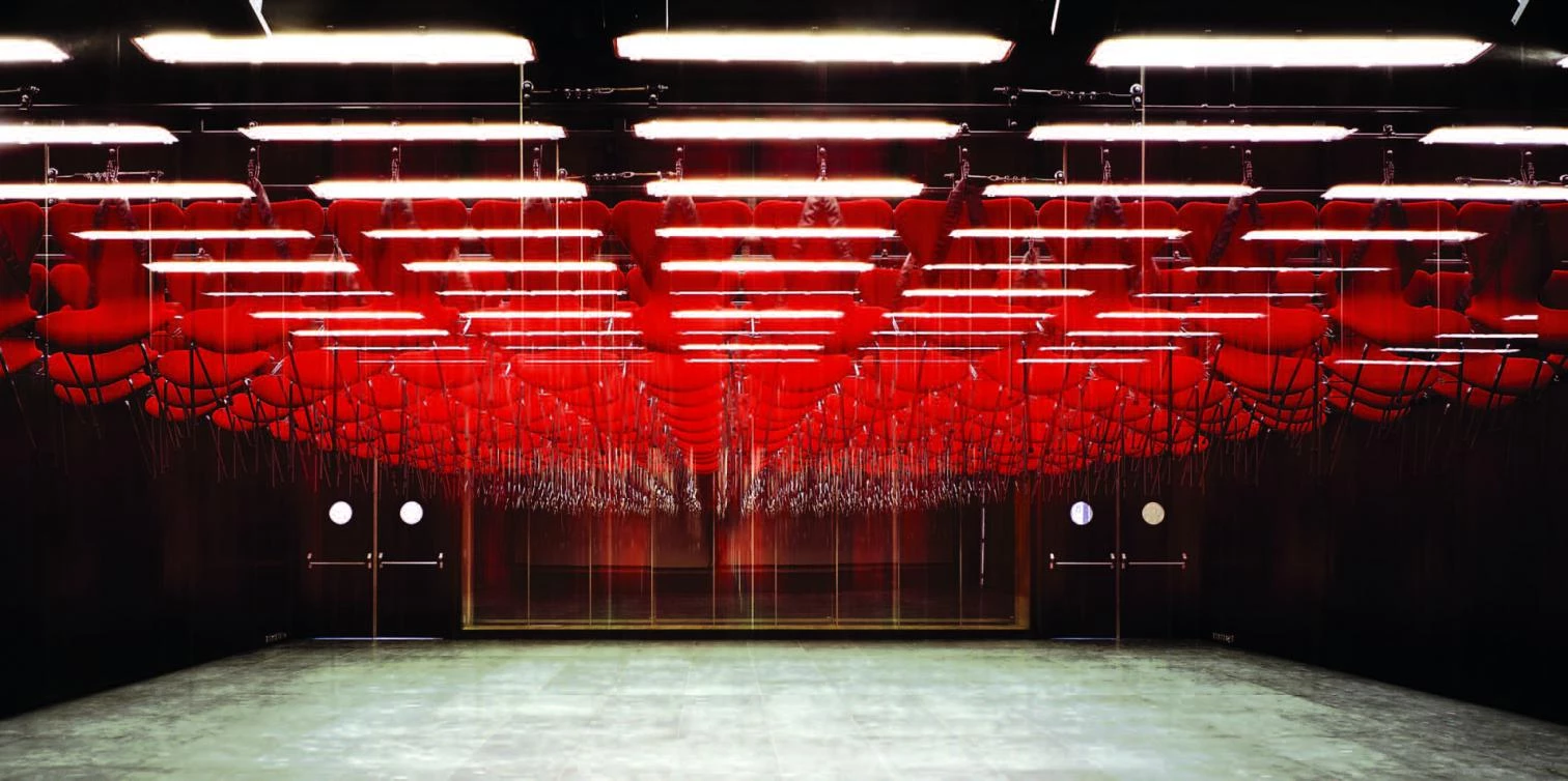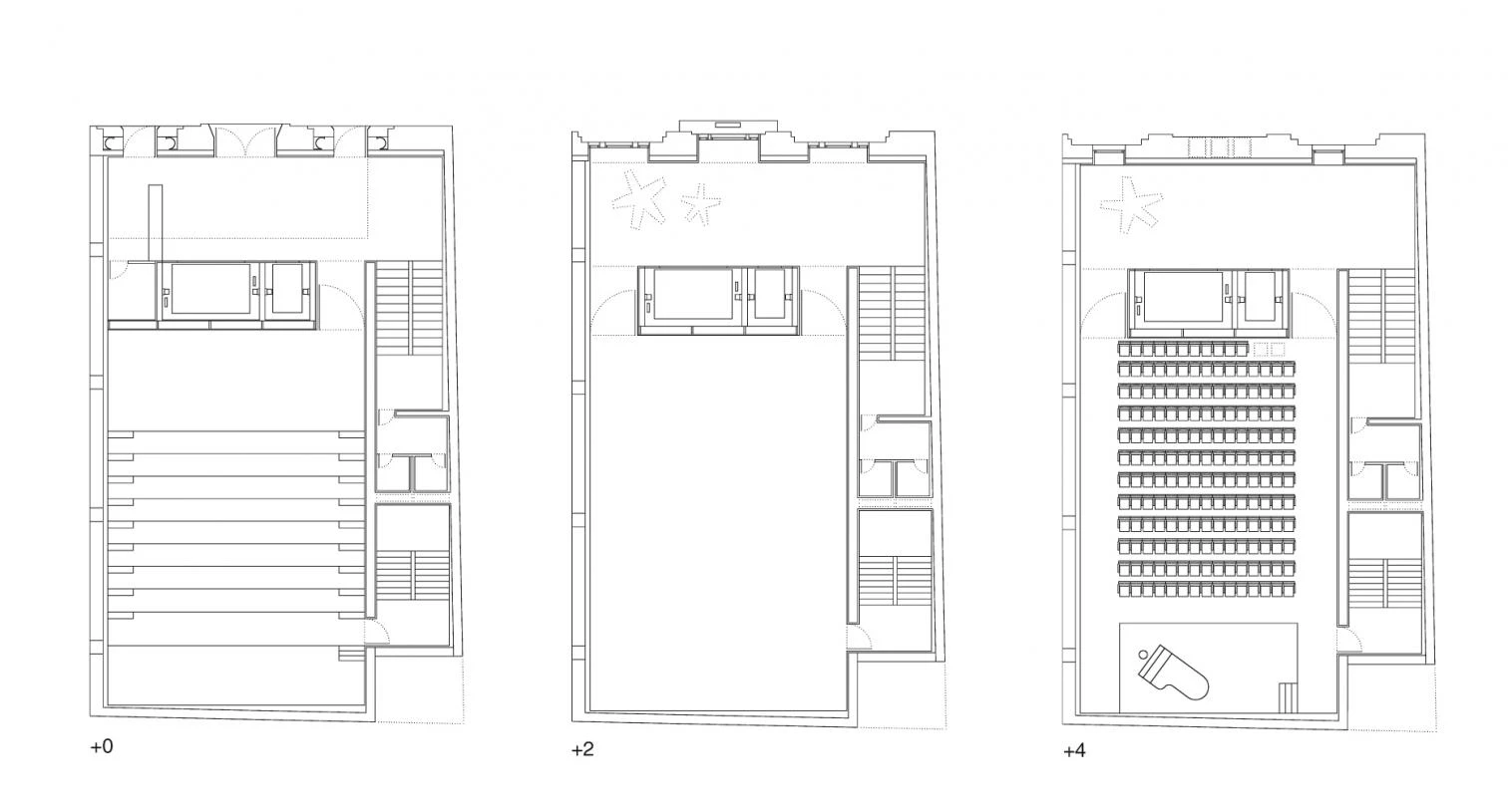 Each one of the four halls can be transformed to different degrees. On ground level, the mobile floor of the ‘magic box’ configures a bespoke seating area, while on the last floor mechanized harnesses hoist up the chairs leaving the space below free for other uses.