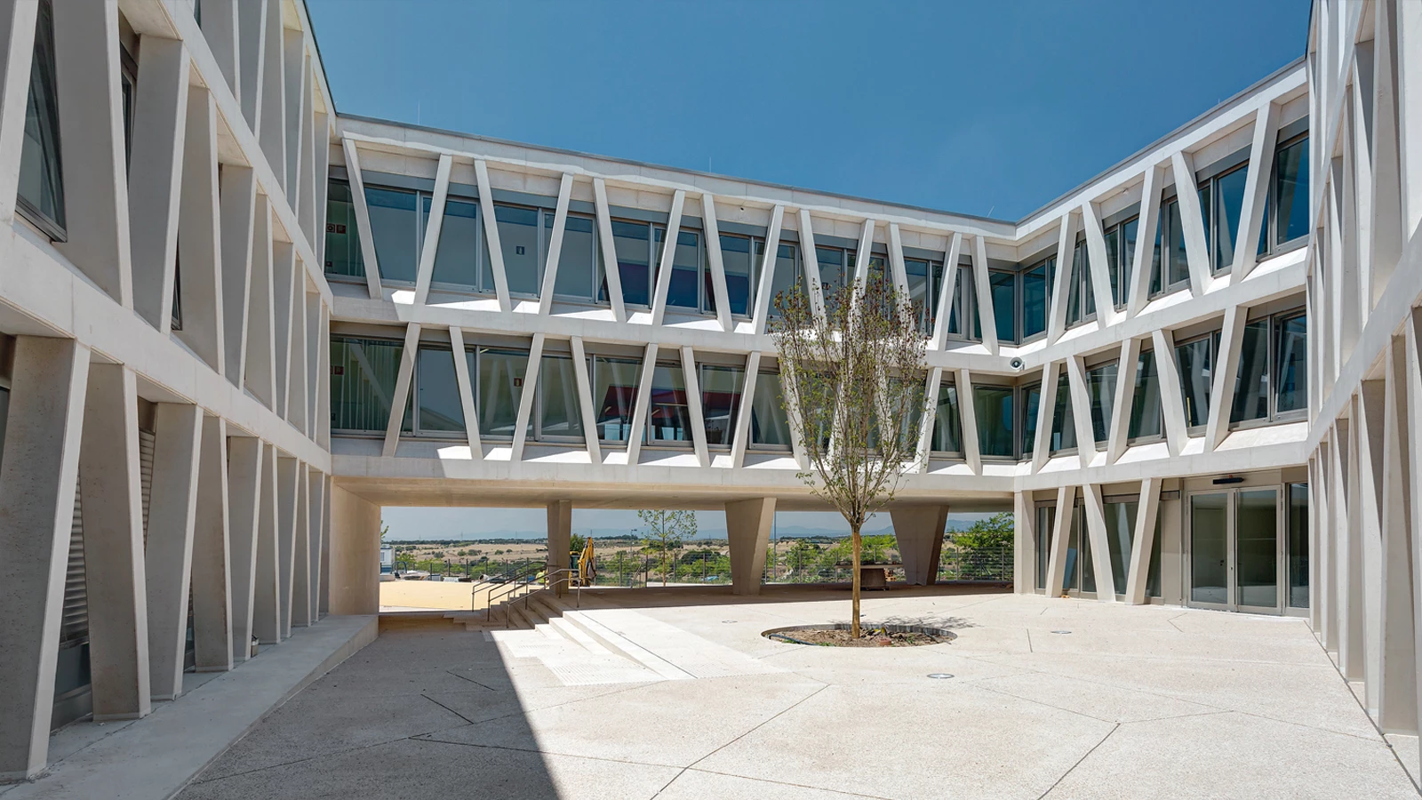 With a strong sculptural presence, the new building of the German School makes up for the lack of distinctive features in the Montecarmelo neighborhood north of Madrid, generating a new geometric landscape that engages in dialogue with the natural environment. Although there are no specific urban landmarks around the site, it does enjoy views of the landscape and the mountains, so the project combines these two opposing situations: on the one hand it isolates itself from its surroundings with spaces that face the interior courtyards and at the same time it opens up through windows that frame fragments of the landscape.