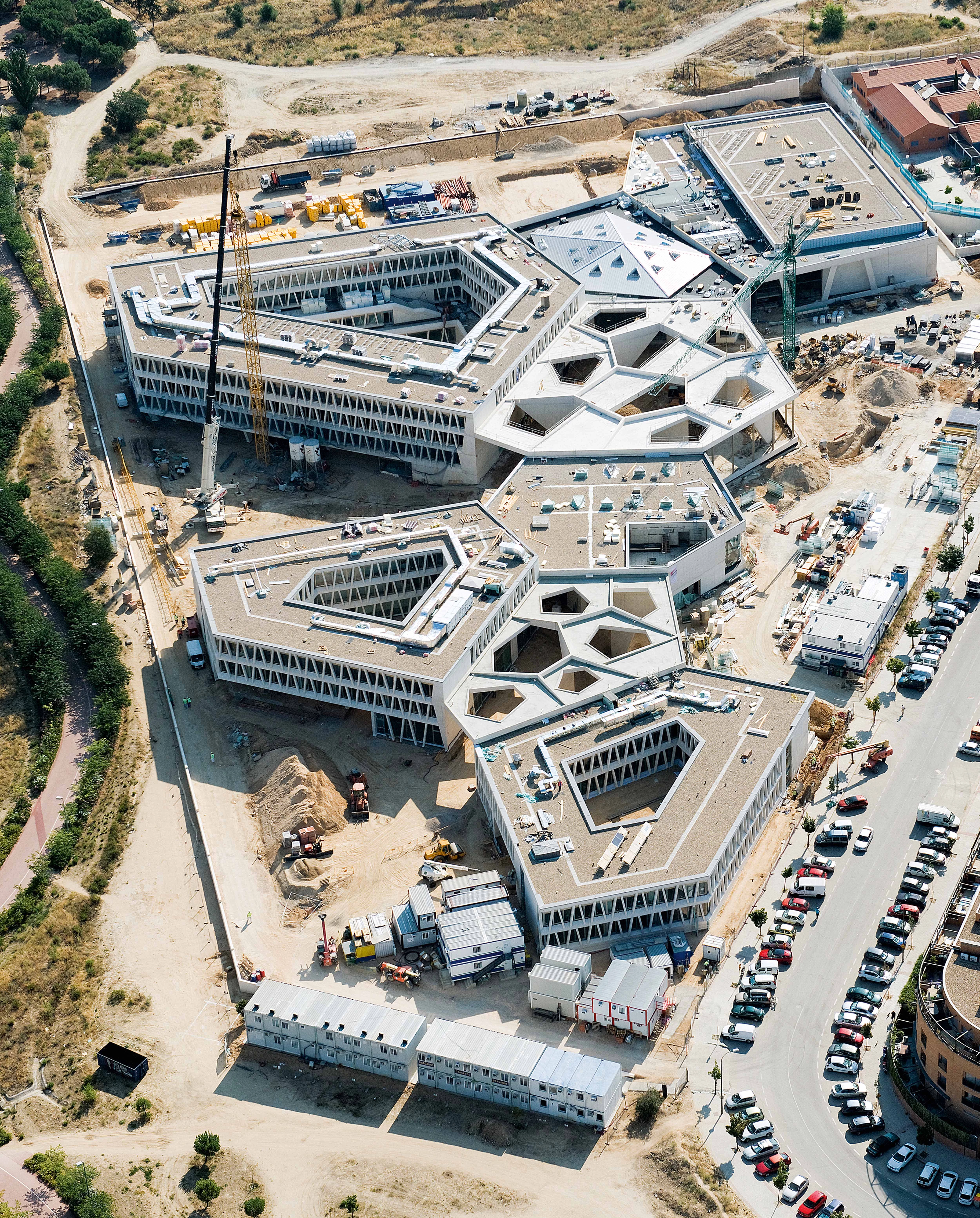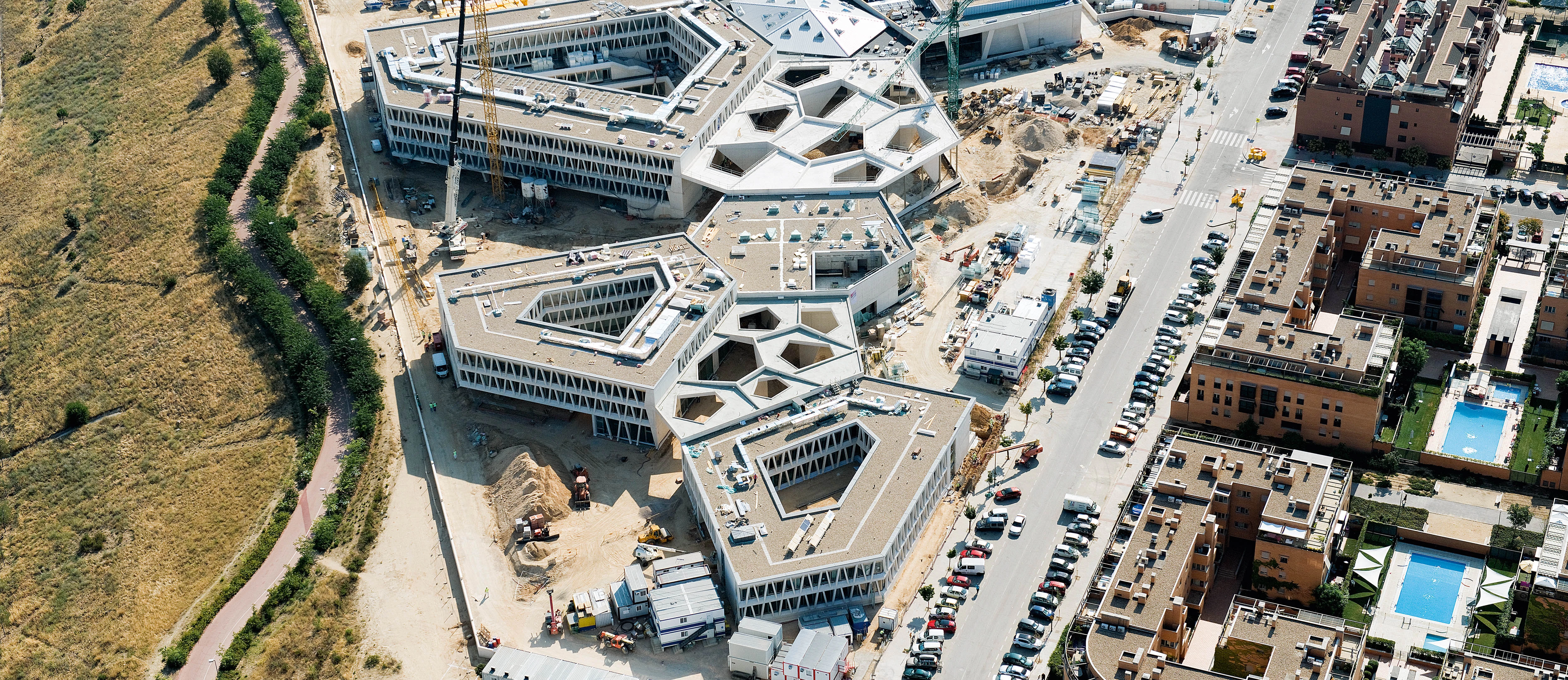 In 2009, the Berlin studio Grüntuch Ernst won the competition to design the new German School in Madrid. Located in the recently developed neighborhood of Montecarmelo, to the north of the city, and taking up a plot of 34,000 square meters, the complex is conceived as a spatially rich geometric landscape that aims to adapt to the climate. Today it is the largest civil project of the German government in a foreign country, accomodating around 2,000 students when it starts running in September 2015. The project has received prizes in Germany for the use of renewable energies, because it includes a thermal labyrinth that resorts to earth temperature in order to control that of the building.