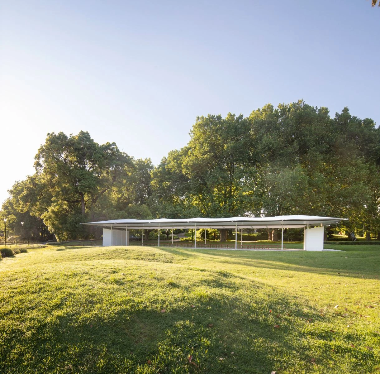 Every year since 2014 the Naomi Milgron Foundation commissions an architect to design a summer structure for Melbourne called MPavilion, and the sixth has just opened in Queen Victoria Gardens. The Australian architect Glenn Murcutt conceived a simple rectangular form and a roof of tensile membrane which, translucent and curved, drew inspiration from the aerodynamic form of an airplane wing. On the inside it incorporates LEDs that, when turned on, make the white building look extra-light. The temporary pavilion faces north to maximize views of the Yarra River, while a textile electronic protection system makes it possible to close up the south side. Murcutt’s MPavilion will be the venue of various events until 22 March 2020.