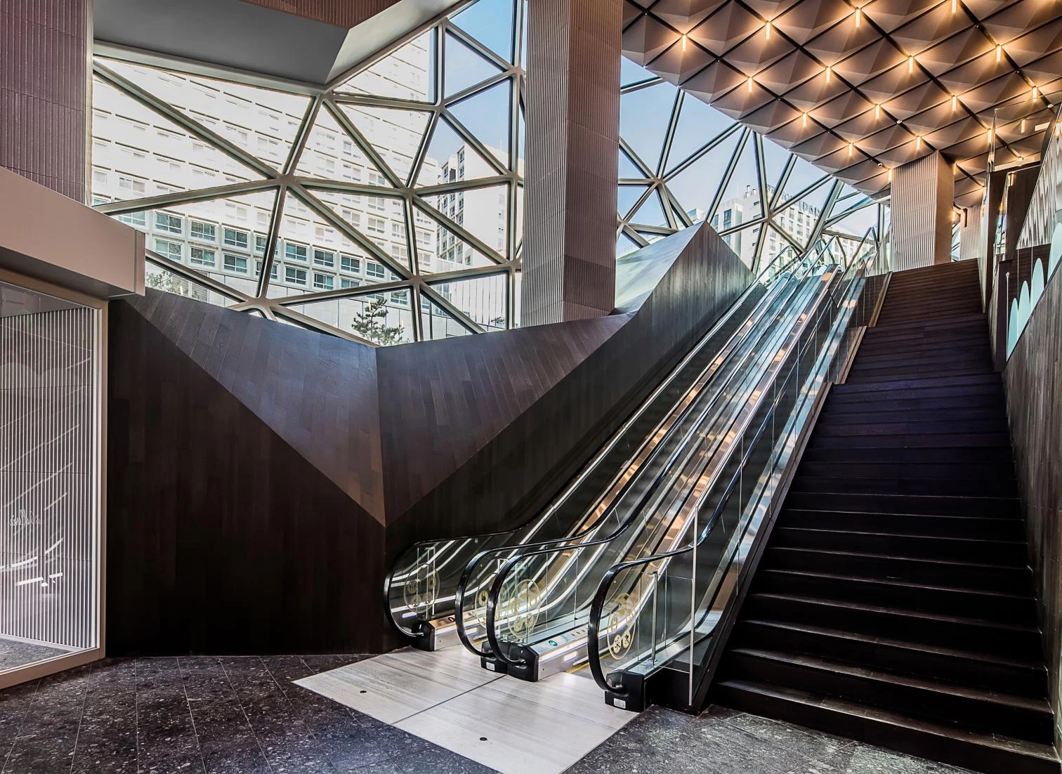Founded in the 1970s, the Galleria is Korea’s first and largest upscale department store franchise, and has remained at the forefront of the premium retail market in the country since then. Located at the center of this young urban development surrounded by tall residential towers, the Galleria’s stone-like appearance makes it a natural point of gravity for public life in Gwanggyo. The store is located between the Suwon Gwanggyo Lake Park and ubiquitous buildings in the city: an intersection between nature and the urban environment. The store has a textured mosaic stone facade that evokes nature of the neighboring park. Appearing as a sculpted stone emerging from the ground, the store is a visual anchor in the city. The monolithic character of the facade and its opacity is altered by a sequence of cascading terraces that, clad with a multifaceted glass skin facade that contrasts with the opacity of the stone, form a public loop that offers spaces for exhibitions and performances. Through the glass, retail and cultural activities inside are revealed to the city’s passersby, while visitors in the interior acquire new vantage points to experience Gwanggyo.