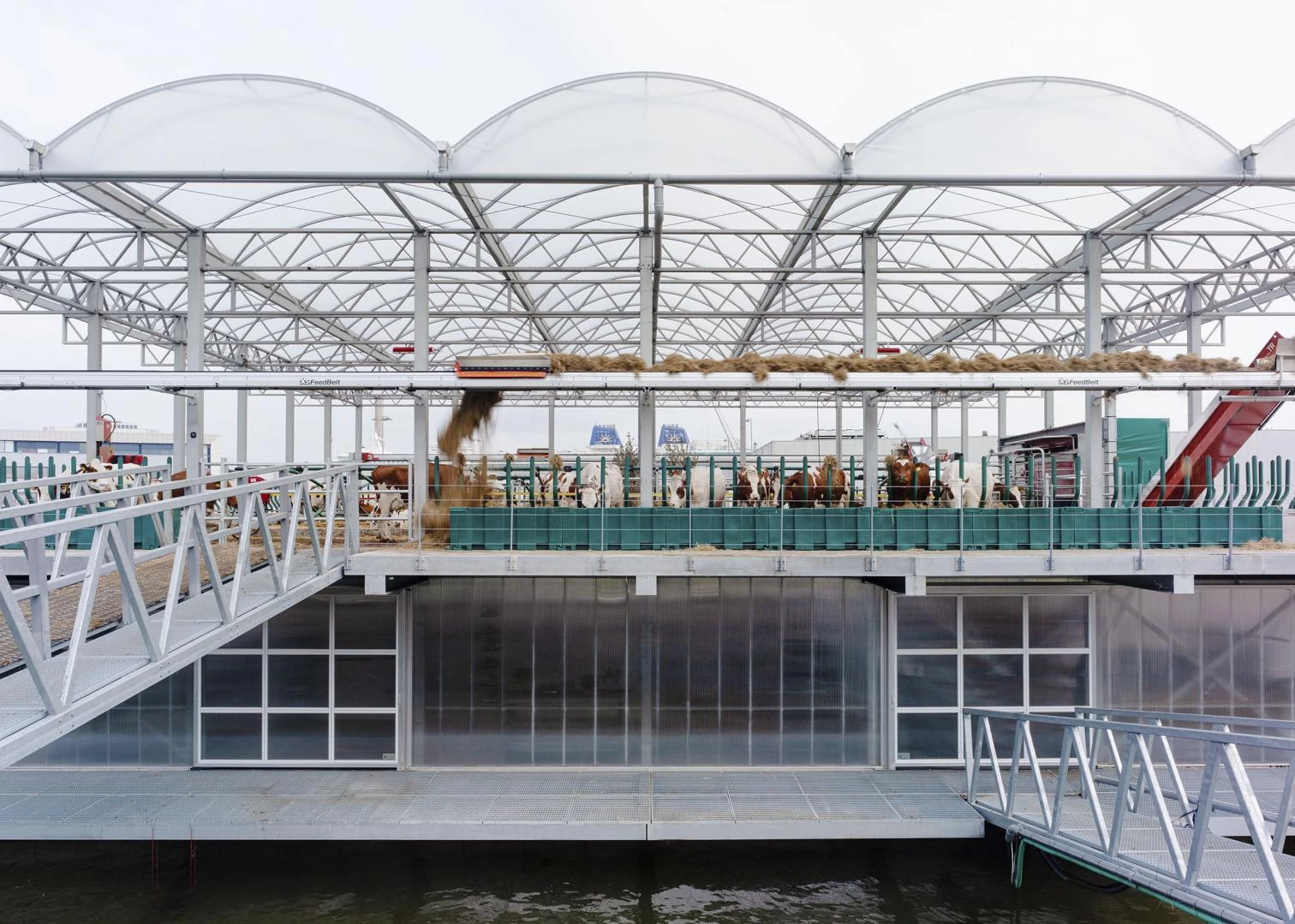In Merwehaven, a harbor zone of Rotterdam, on the right bank of the Meuse River, rises this agricultural construction where dairy products are made and processed. The design by Goldsmith Company, a local practice, is based on nautical principles, taking into account the progressive rise of sea levels and the frequent flooding of the Netherlands. The organization, the structure, and the use of materials all collude to maximize the building’s buoyancy and stability. In the tripartite stacking, the heavy elements are submerged. Able to take in 40 cows, the floating dairy combines technical installations – for storage, processing, and production – with robots for milking and manure-cleaning, solar panels, and a rainwater collecting and purifying system. Under a huge cantilevering roof, the 2,000-square-meter complex also includes a route for visitors to follow without interrupting dairy activities.