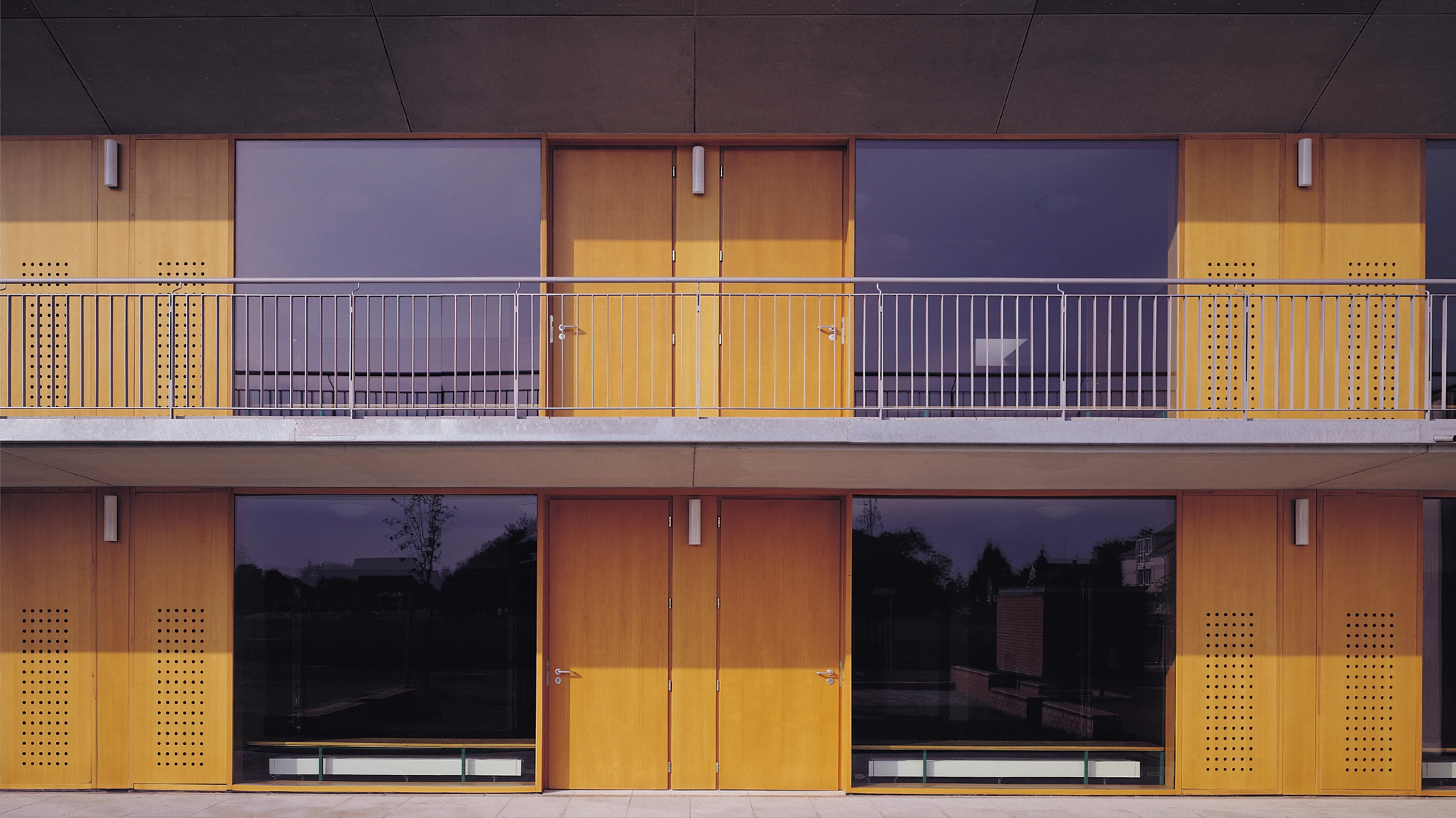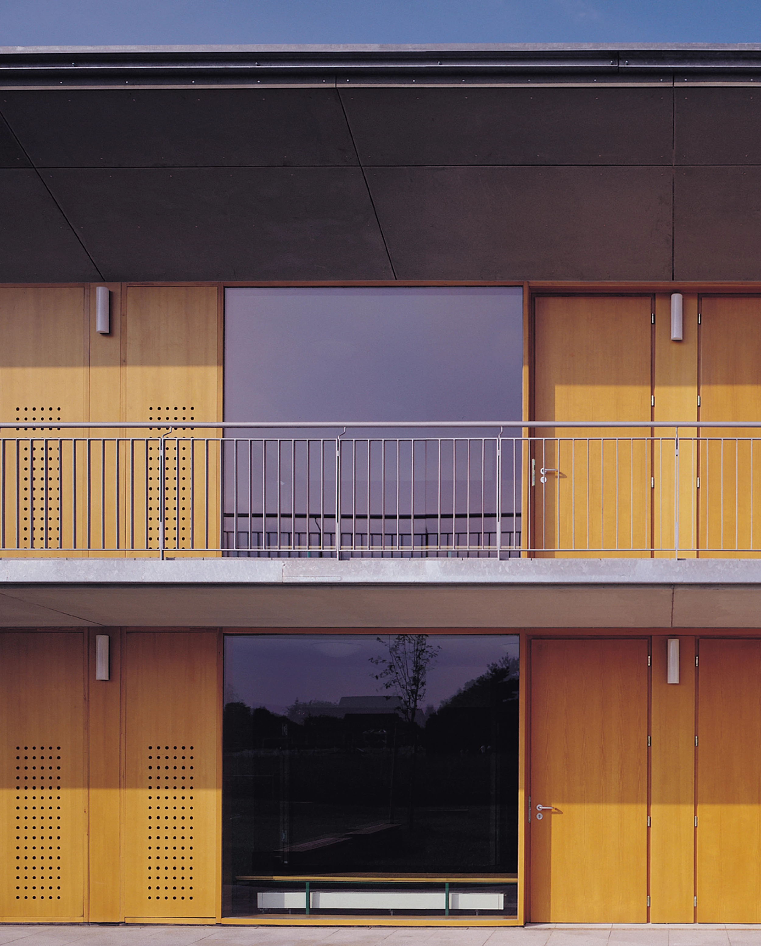 Con una clara voluntad de vincular las zonas lectivas con los espacios al aire libre, las aulas se abren, mediante puertas y generosas cristaleras, al patio. El léxico constructivo utilizado intenta transmitir esta condición ambivalente del edificio, mediante muros macizos de ladrillo hacia la calle y paneles de madera laminada y vidrio hacia el patio…[+]