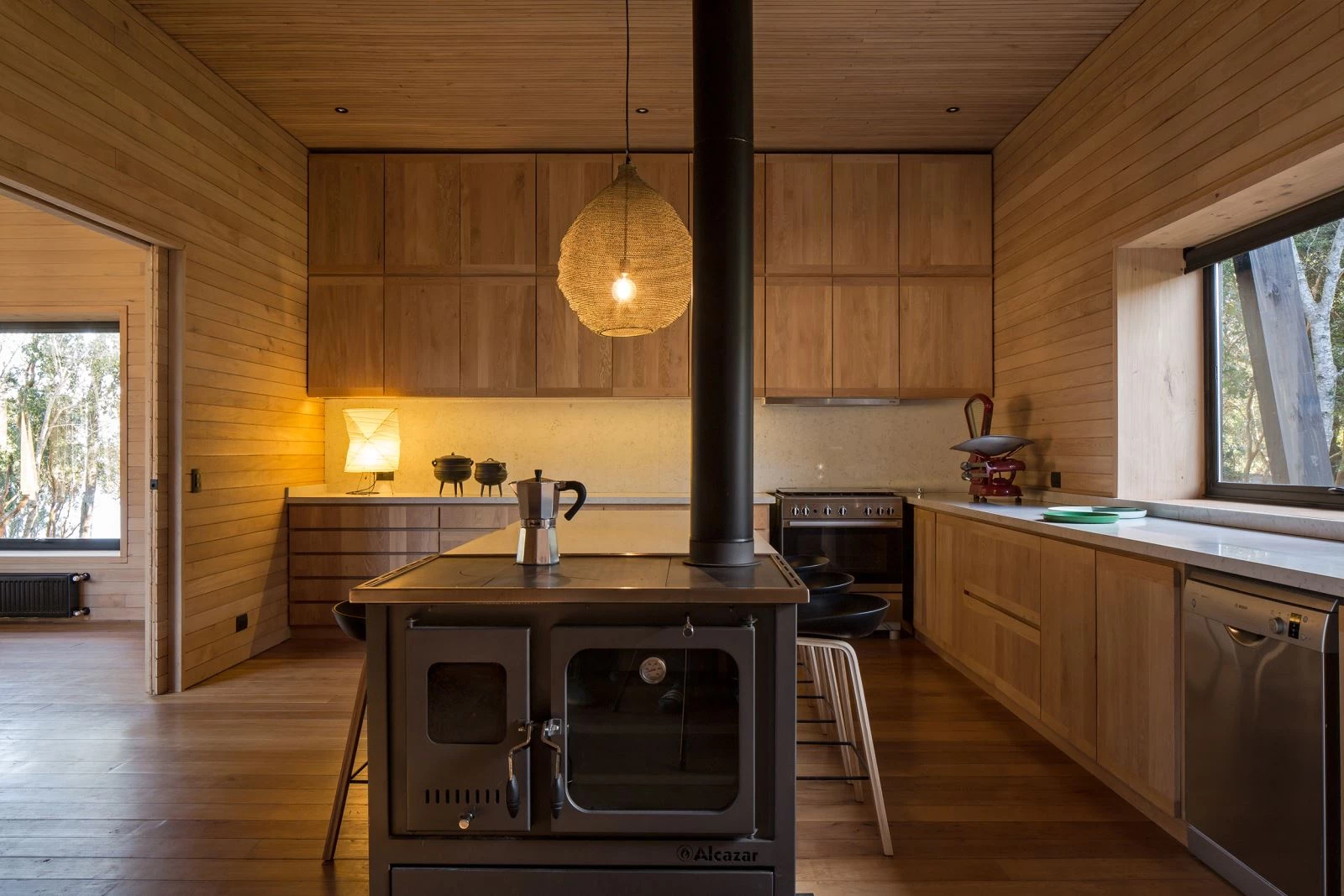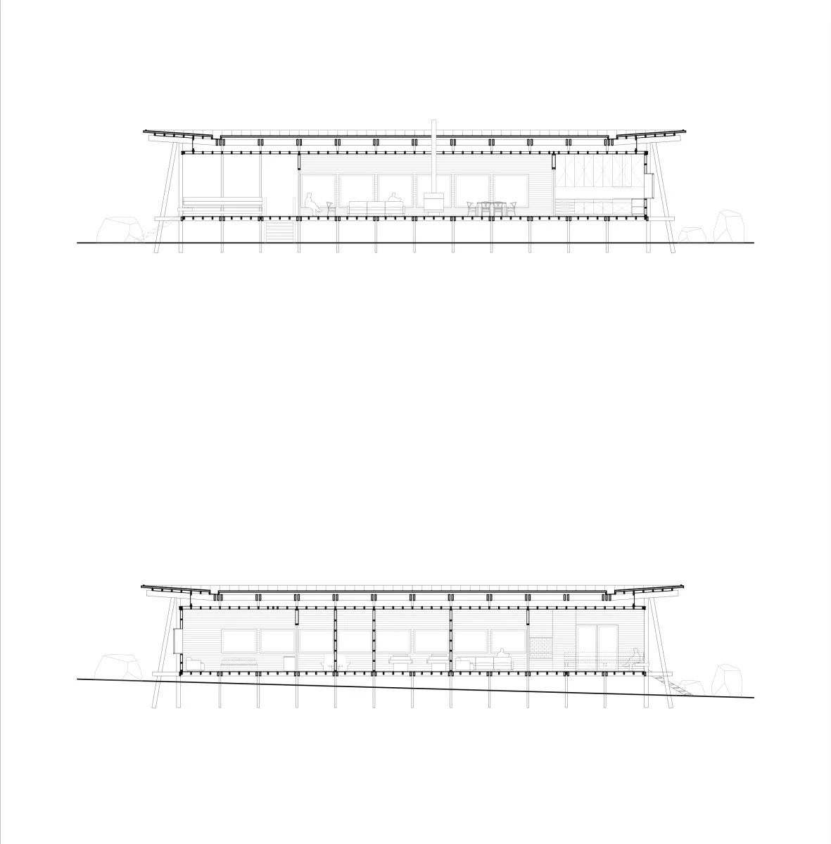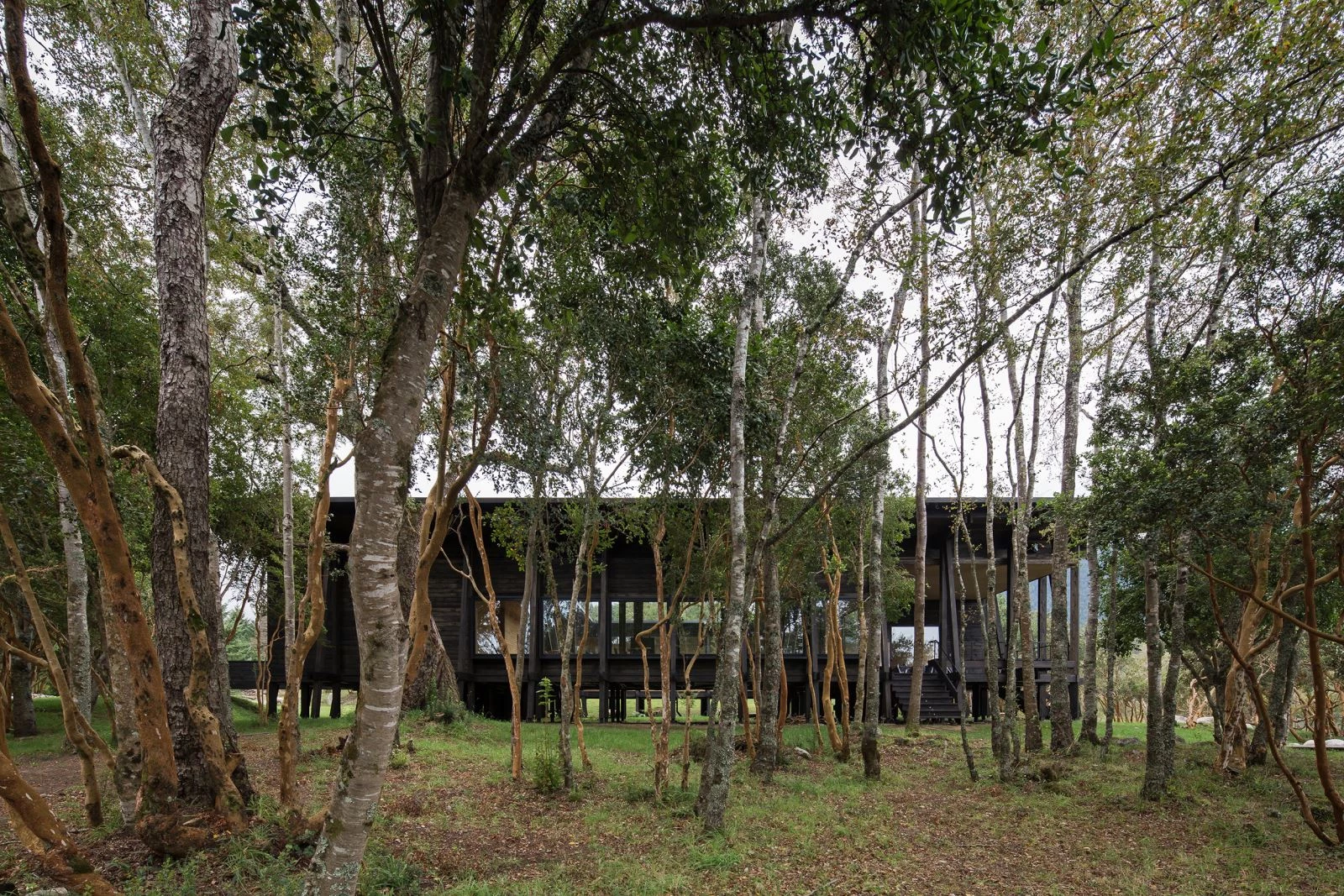 In Chile’s Los Ríos Region, along the shore of what is one of the South American country’s largest lakes, stands this vacation home designed for a big family. Its construction system – composed of a frame of timber beams and pillars on props – is reminiscent of that of trout smokehouses found in the area, but inverts the traditional order, and the structure of the building forms an exoskeleton over the enclosure, exposing the loadbearing elements under a generous protective eave.