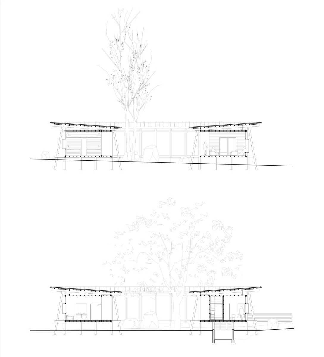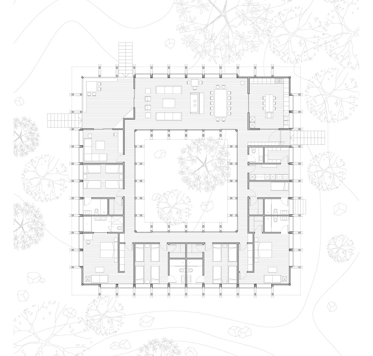 The domestic spaces are organized around a square-shaped courtyard, a central void that ensures there is cross ventilation and natural light in all the bays. It also channels rainwater in the manner of an impluvium. Because the rooms look out in two directions, the residents have multiple views to relish: not only the lake panorama close by and the Andes mountain range in the distance, but also the surrounding lakeside woodland, and on the other hand the hortus conclusus that encloses a patch of virgin nature in the very heart of the dwelling.