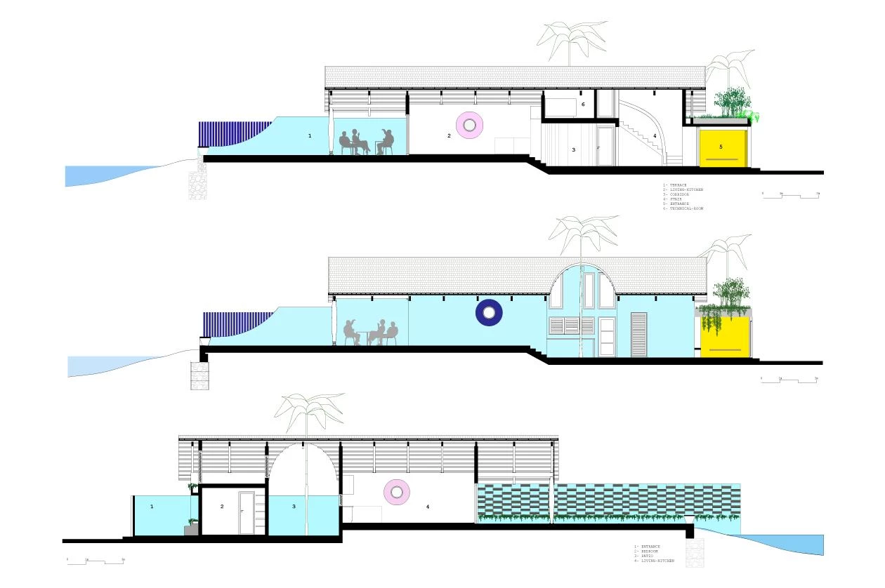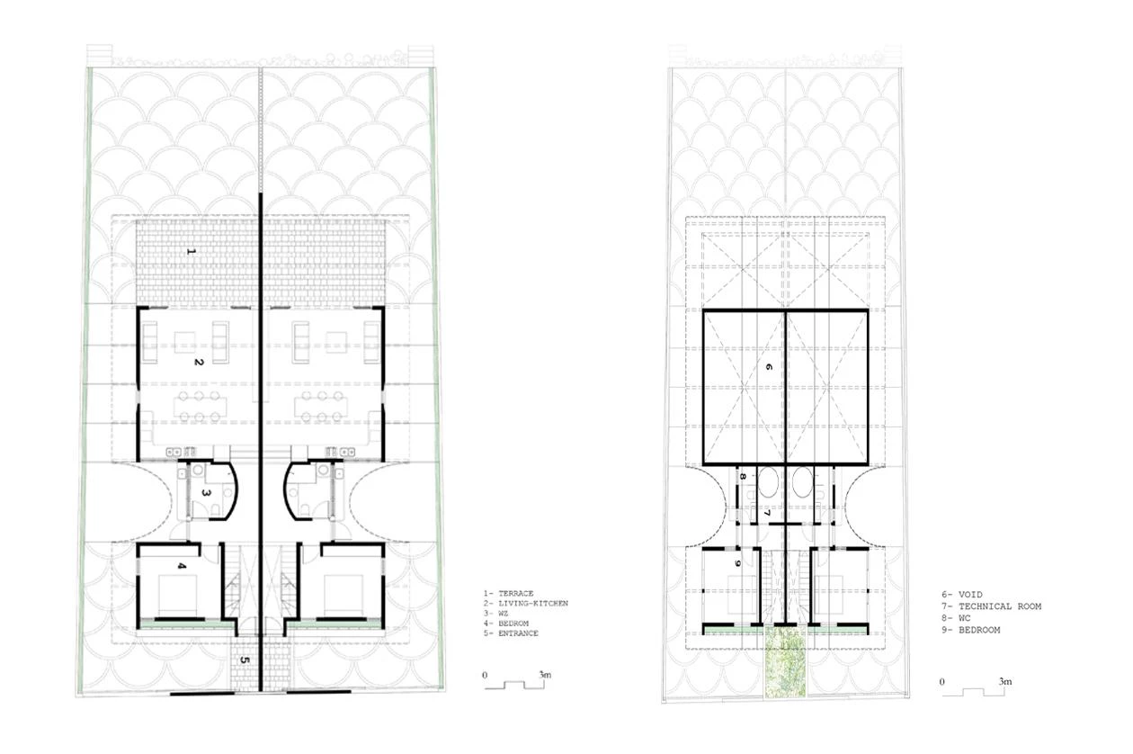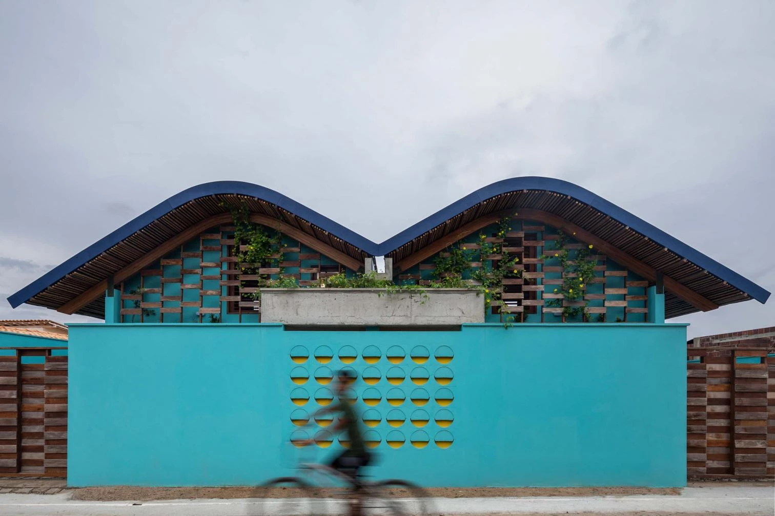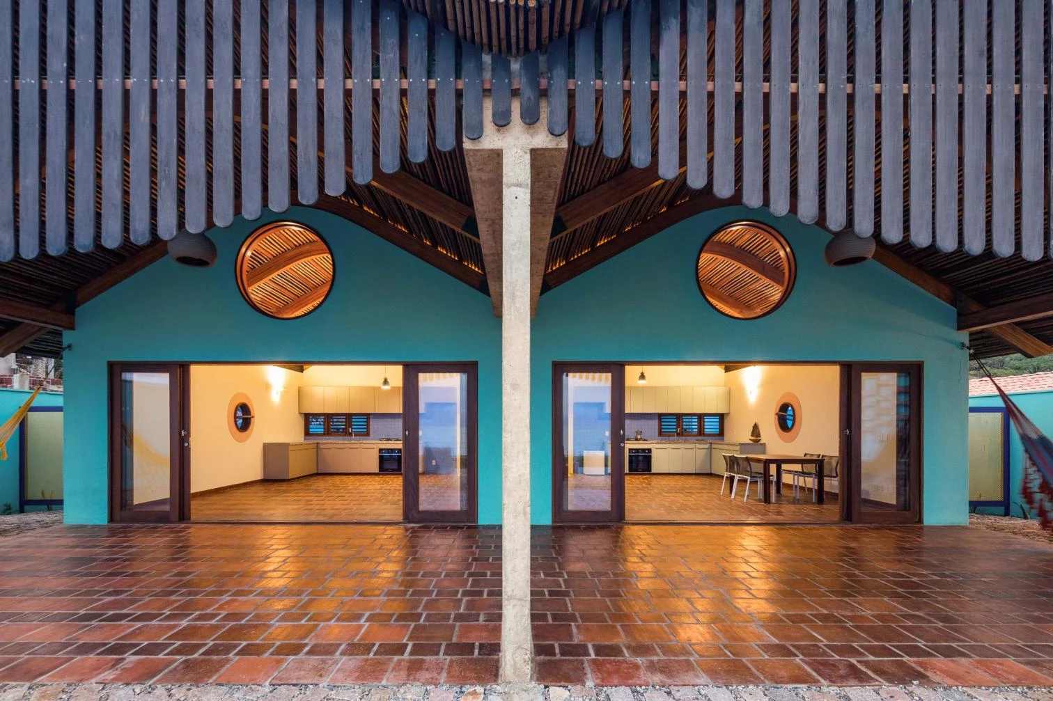 On Sagi Beach (Baía Formosa, Brazil), the Gutter House project creates twin homes for two friends. A double roof coated with wooden 'scales' forms two waves that engage in dialogue with the dunes of the landscape, and irrigate the flower beds by pouring rainwater into a 22-meter-long concrete gutter clad in blue tiles.