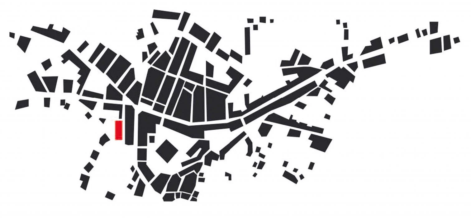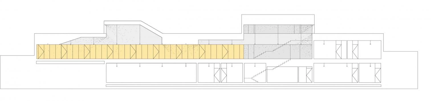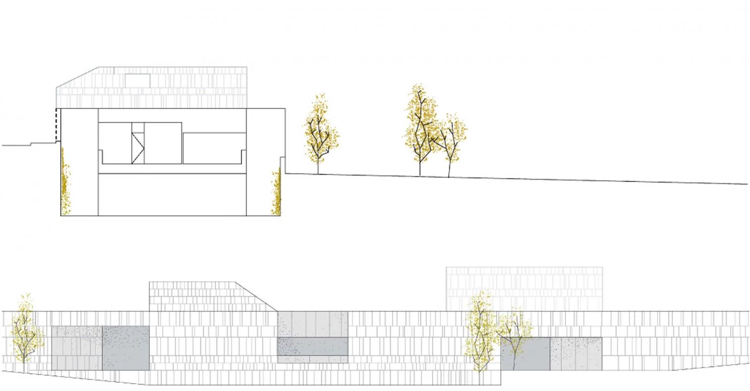 The building is slightly burrowed, which ensures that the upper street will have proper sunning conditions, but also that it will be read as a party wall, more in tune in terms of scale with the rural environment in which the building goes up. Starting from a compact prism, perforated by four courtyards, two isolated volumes trace a cracked profile.