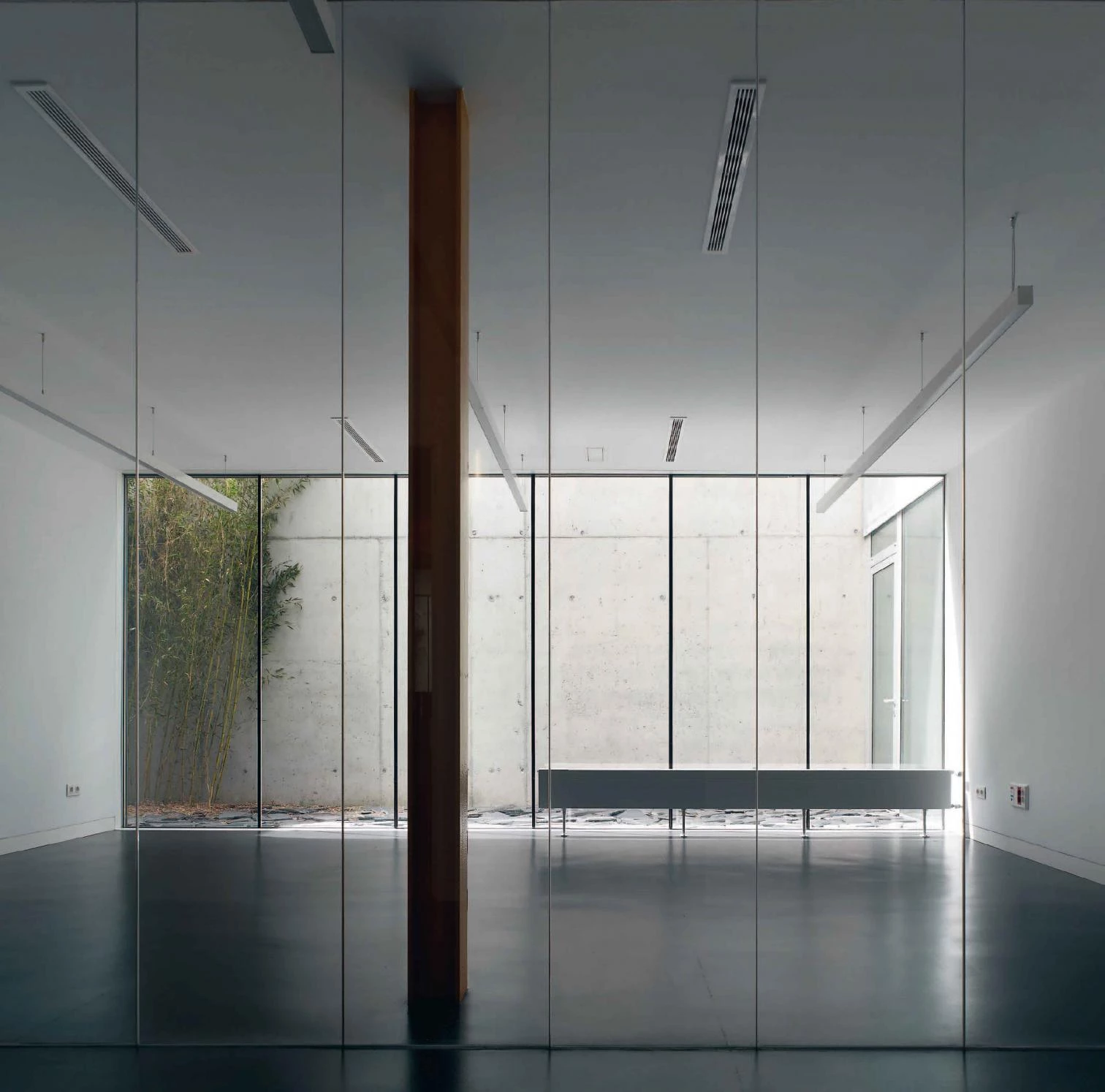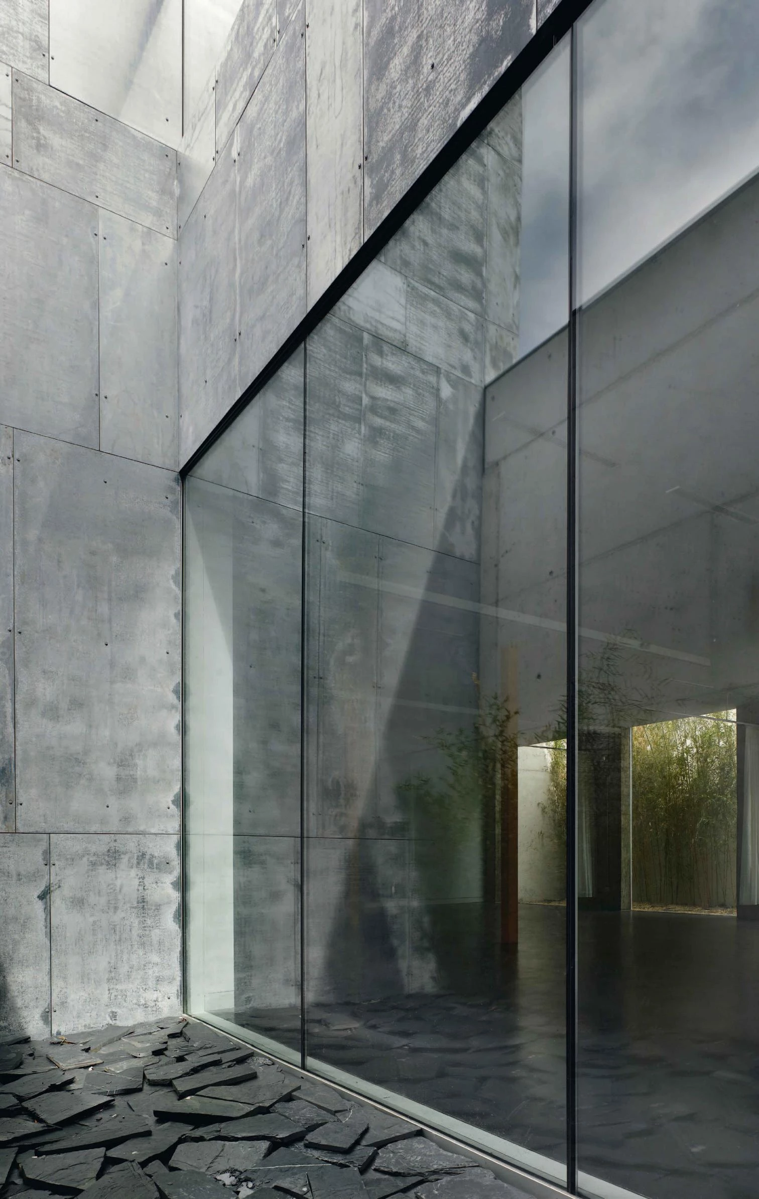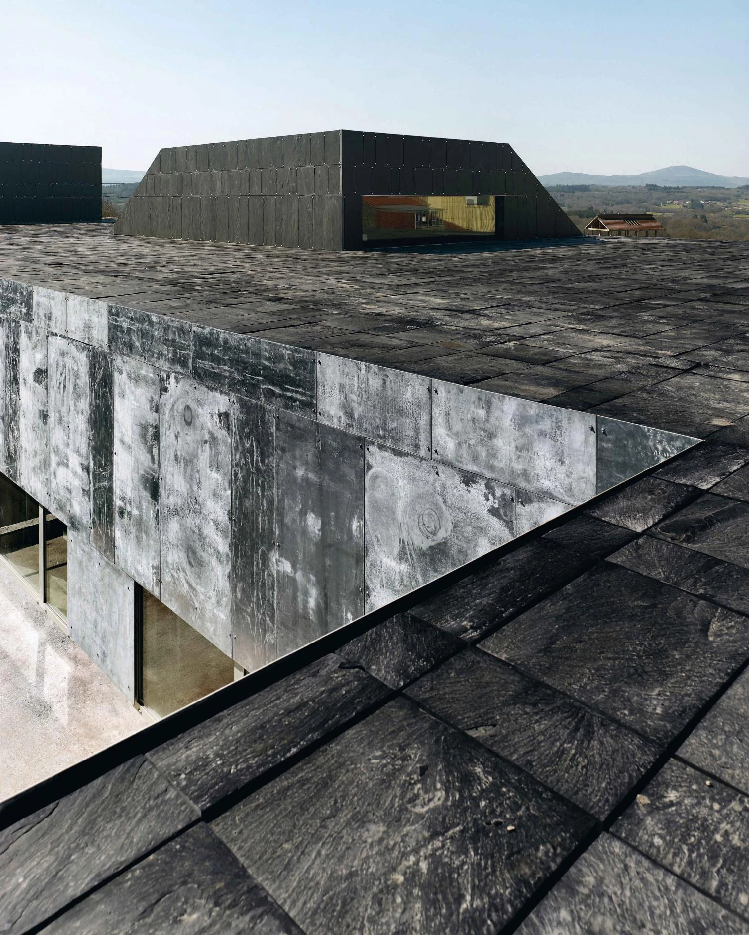 Four courts nuance the contact with the exterior and illuminate the buried areas; a continuous slate skin covers facades and roofs, with strategic breaks of galvanized steel in the access, courtyards and windows.