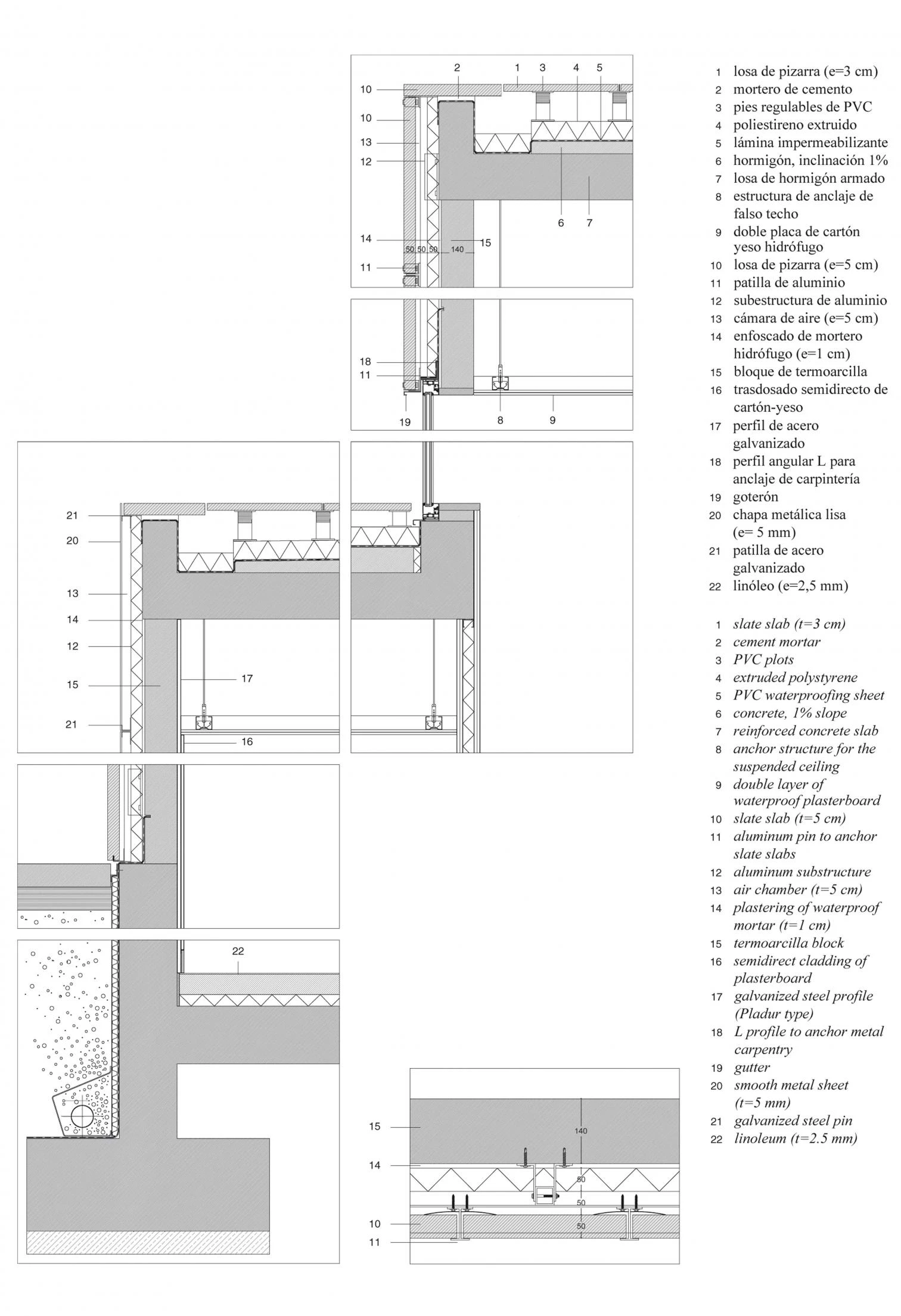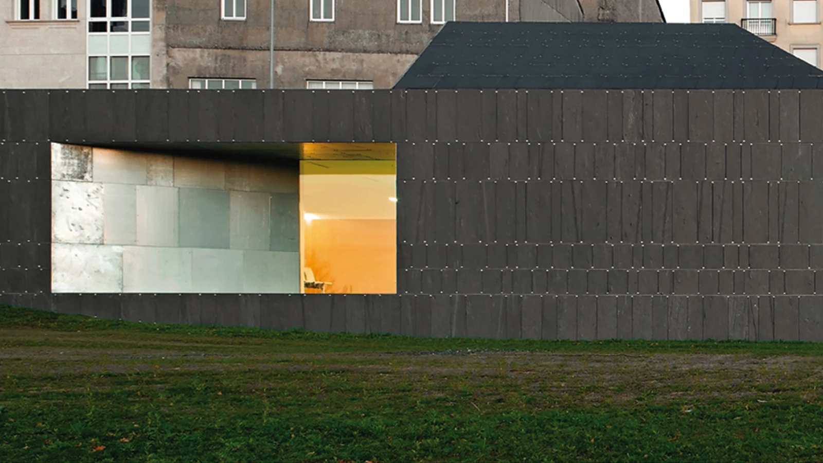 The partially buried position of the building makes the roof stand out, which is clad in slate and in this way extends the facade skin. The detailing of the elevations is based on horizontal bands of different height, fragmented in a discontinuous manner in a vertical direction. Each one of the volumes rests on an aluminum substructure and is held by metallic pieces.