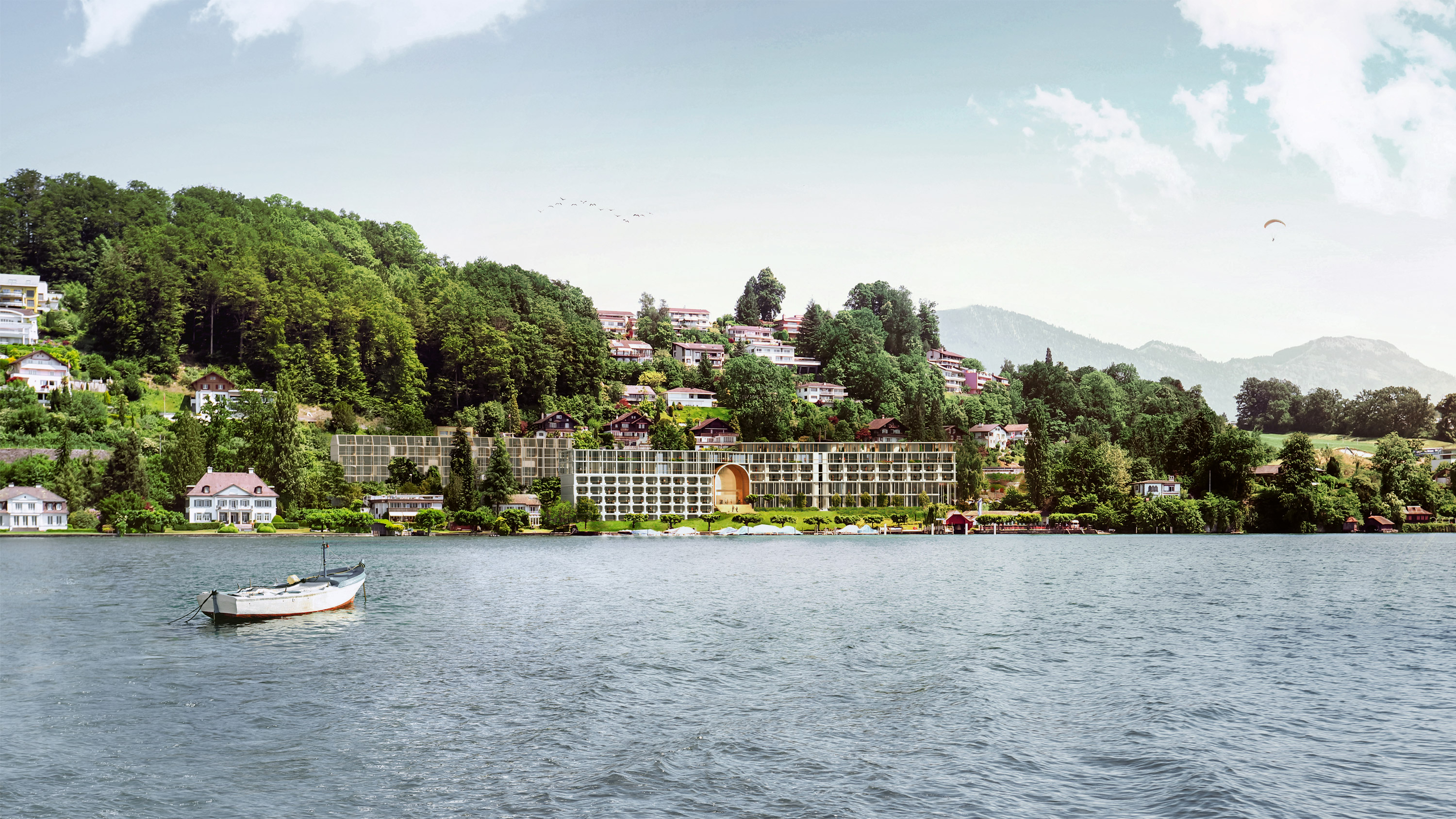 The hermitage Hotel, located on the shore of Lake Lucerne and facing Mount Pilatus, is set to undergo a transformation. The current hotel, a blend of structures from different eras, will be renovated and consolidated into a harmonious, visually striking building that honors its unique and spectacular location. A new, large public entrance hall will connect the two existing buildings, unifying them into one ensemble with two wings. The ensemble will expand with two additional levels in a light wood construction. Moreover, the existing facades will be covered with a filigree wood structure and a layer of wood balconies facing the lake. Building on the built preserves the existing and historically valuable, small-scale structures such as a barn, baths, and boat house and leaves room for an open green space. A new residential building across the street on a hill will be a second extension. The slender wood building will be a counterpart to the hotel, similarly fitted with timber loggias, forming an animated streetscape at the city’s entrance...[+]