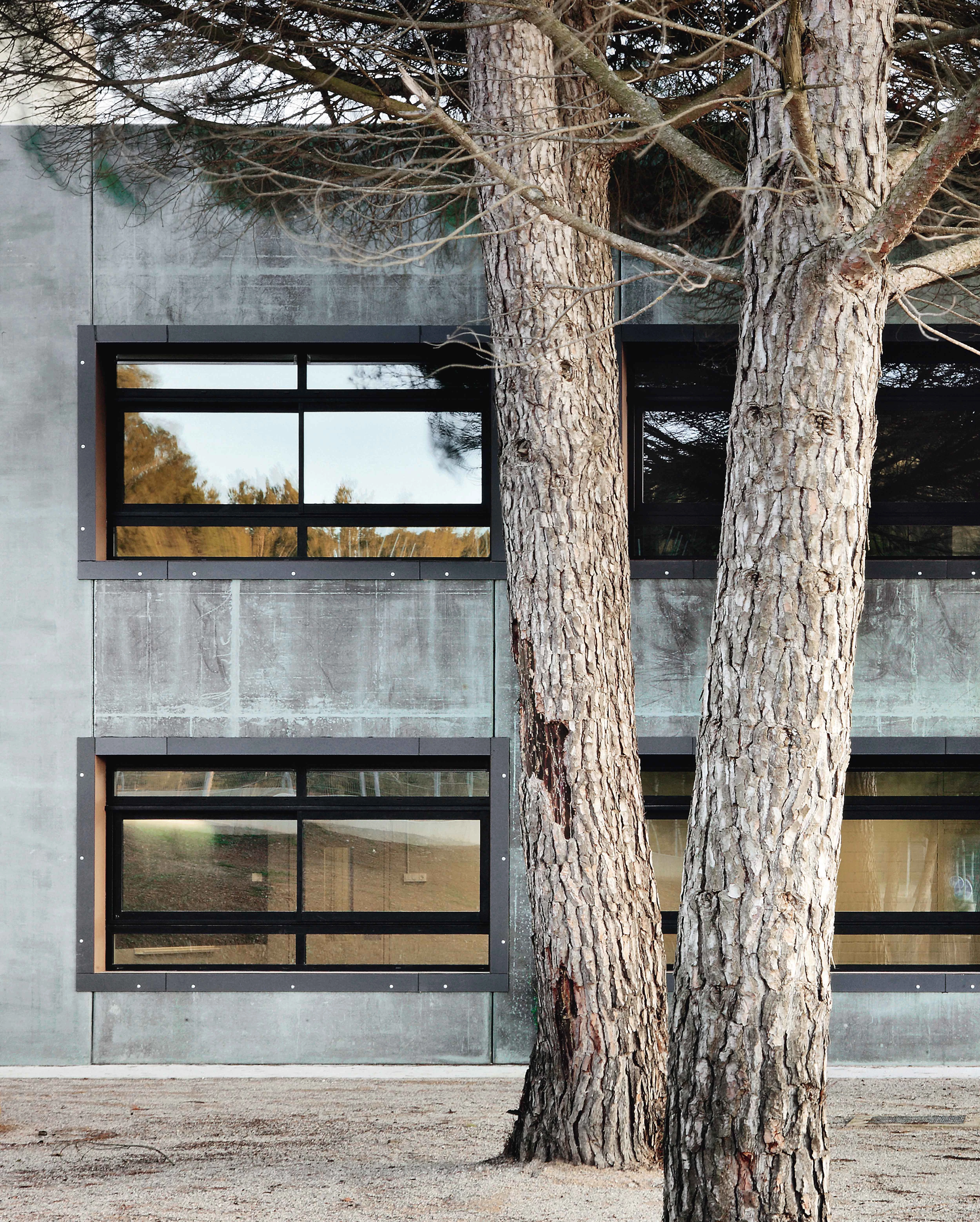 The wooded landscape where this high school goes up has determined both how the volumes are articulated as well as the exterior appearance, defined by the greenish tone of the precast concrete facade panels.