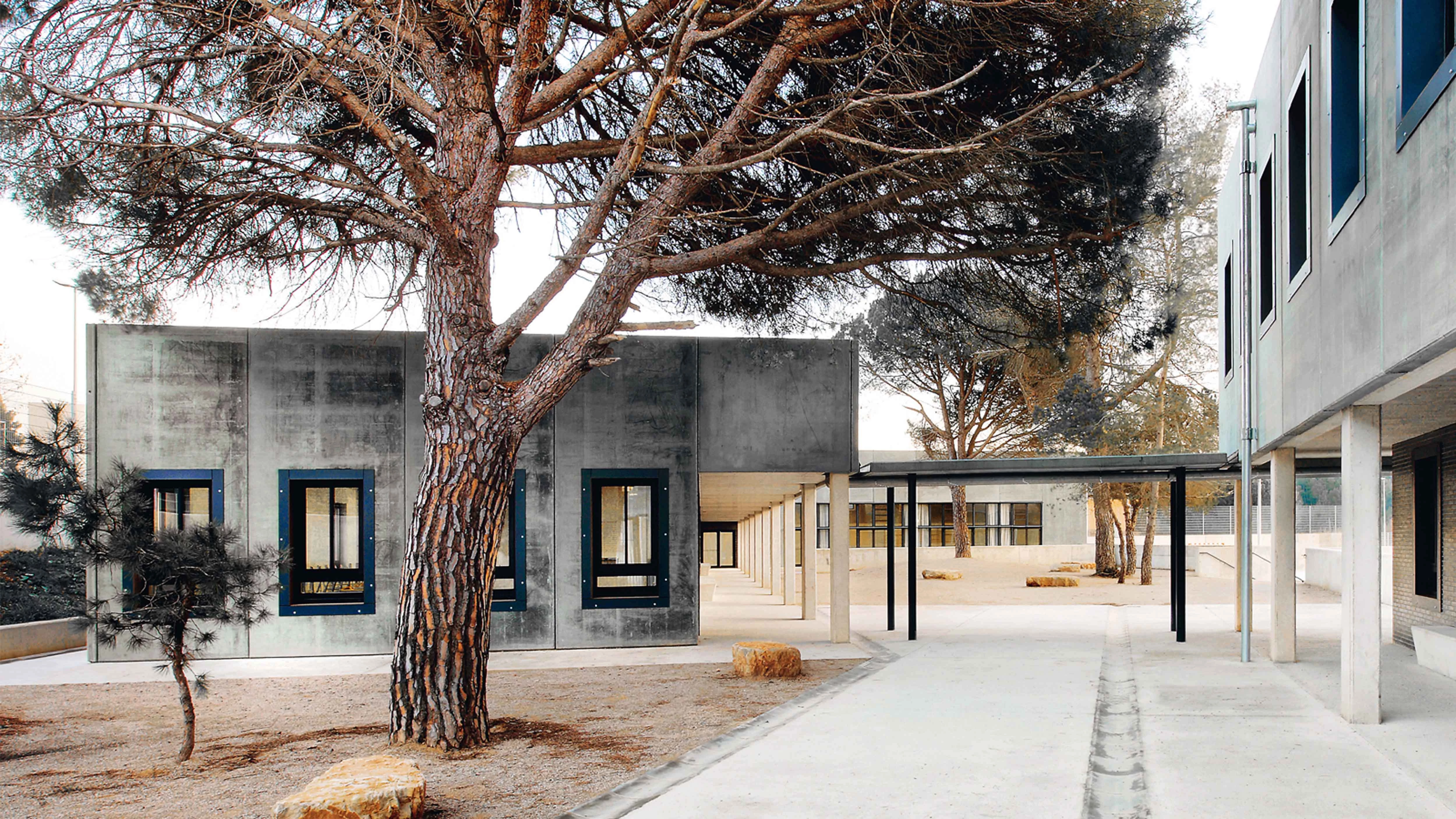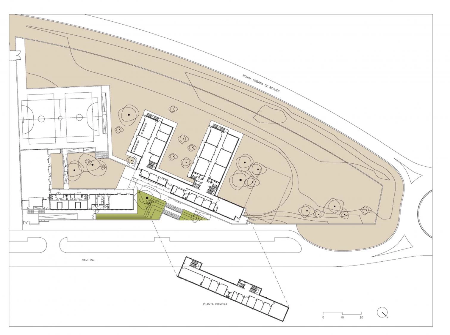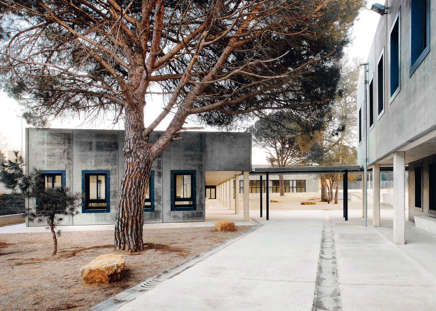 Access is through the Camí Ral (name given to the main public path before the road was built), located in the most elevated part of the site. At this point the building breaks the alignment with the street, separating itself from the sidewalk and taking advantage of the topography of the site to create a gathering place and an access. The center of this square is presided by a tall pine tree, which stresses the importance of this space that organizes the arrival and exiting of students, and that becomes a gathering place before and after class.