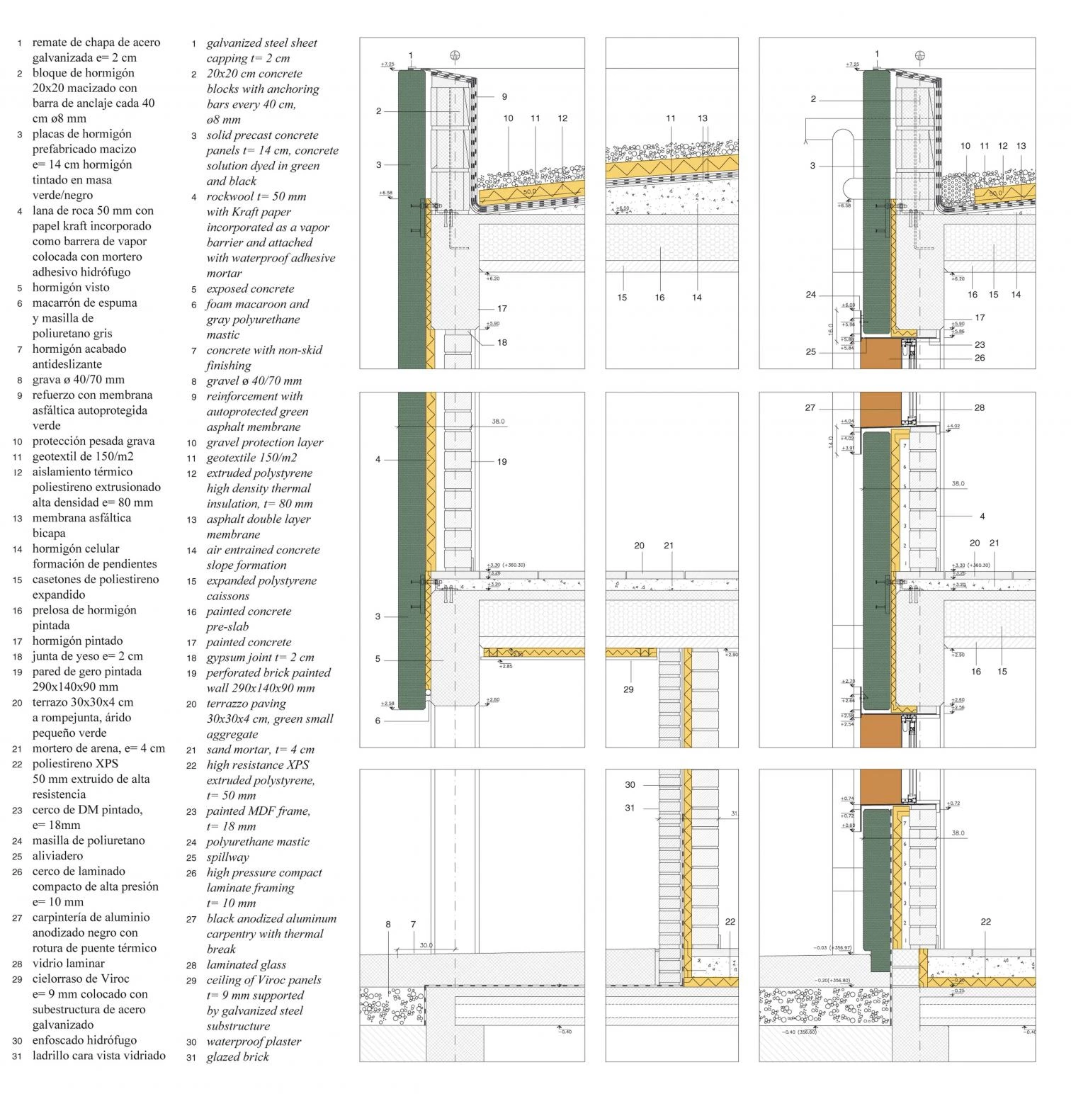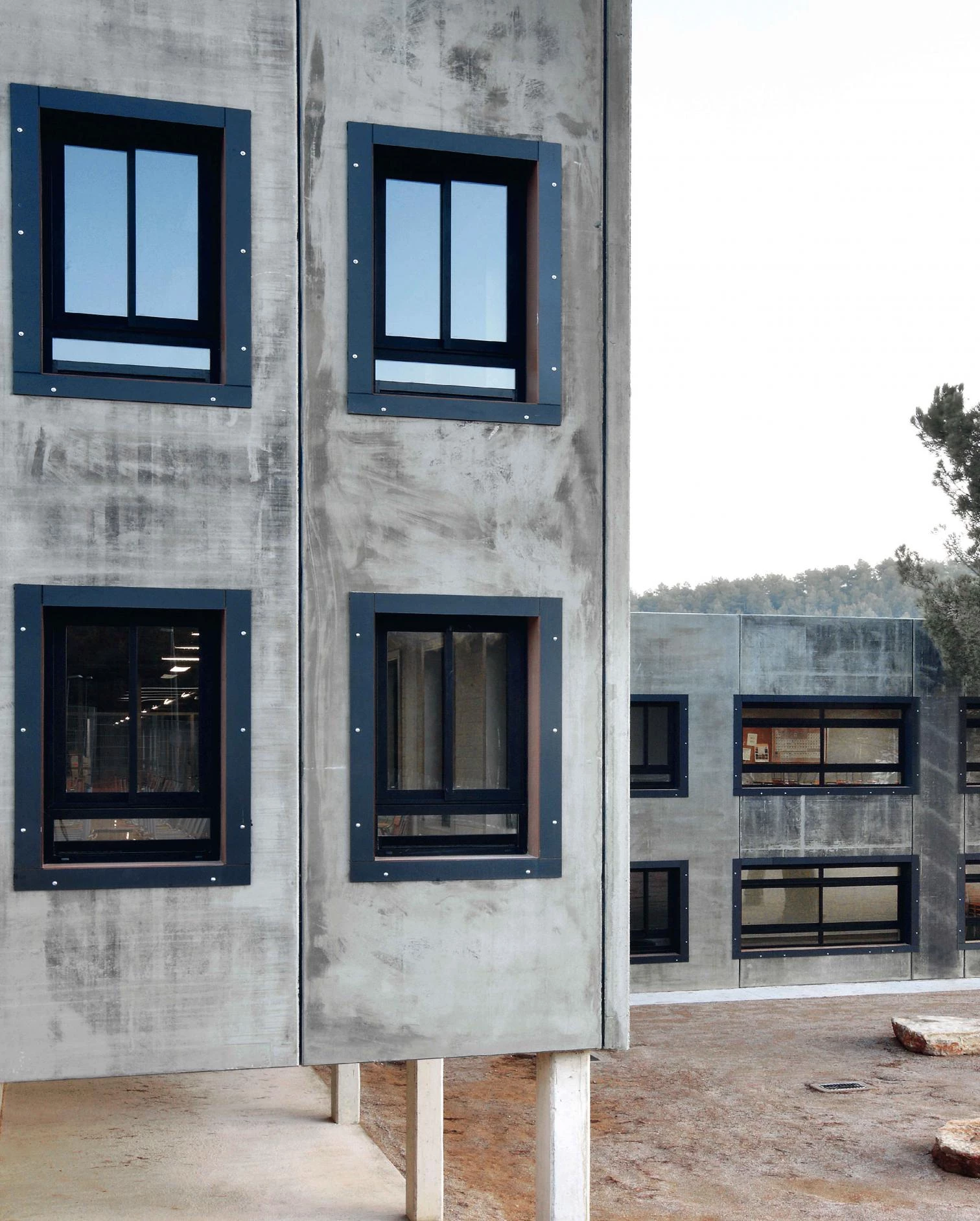 The buildings are completed with a semi-prefabricated concrete structure, with reinforced concrete pre-slabs and self-bearing double T plates. The facade treatment, for its part, becomes a unique aspect of the complex. The use of precast enclosures, dyed with a mixture of green and black tones, achieves a texture that makes the building blend with the landscape of pine and oak trees.