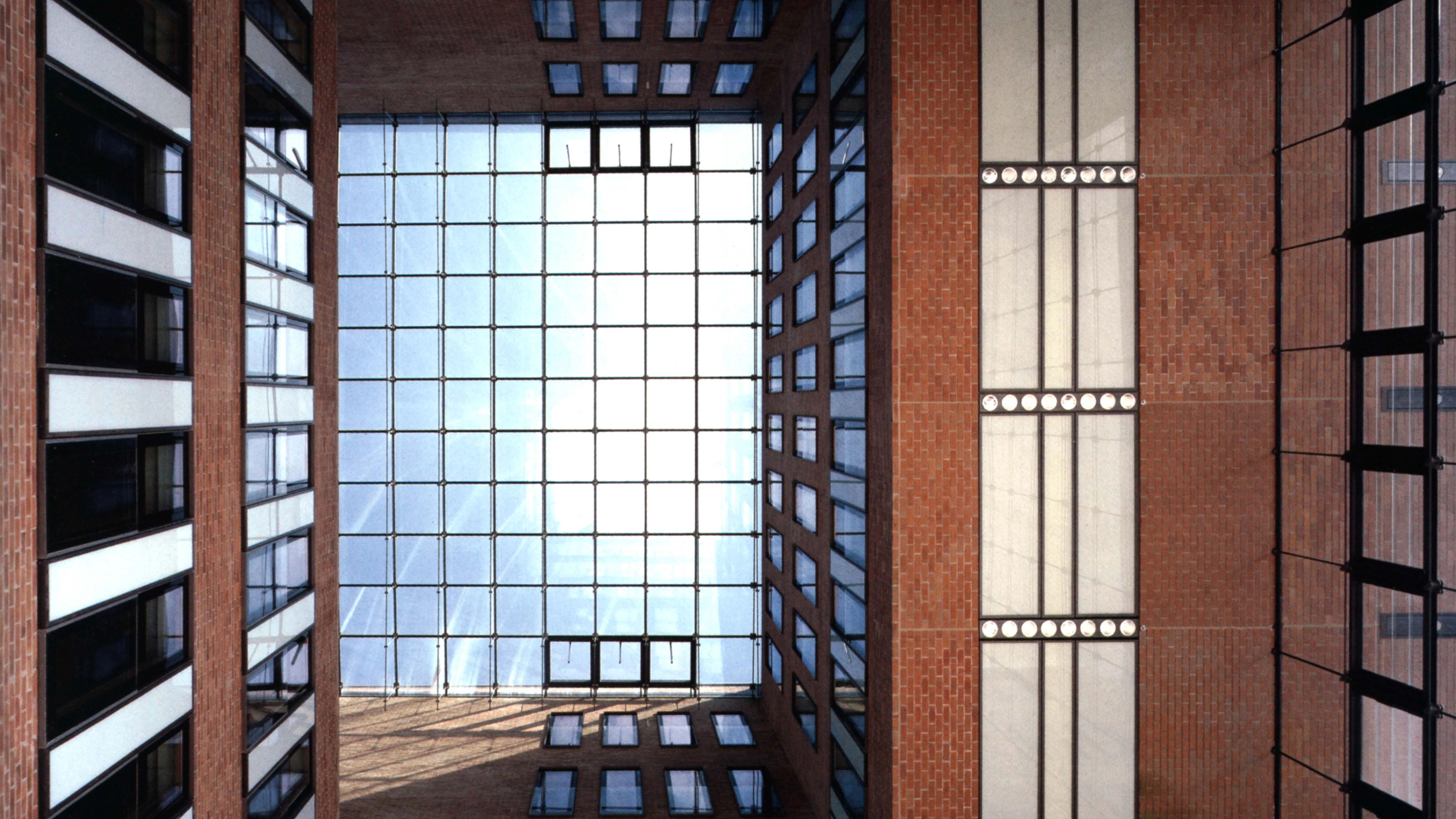 Recently completed, the block known as Holzhafen Ost now offers 16,000 square meters of offices right on the coastline with a prismatic and ceramic volume whose elementary geometry reflects the character of the port warehouses. Four transversal bays on the shore are joined alternatively by way of oblique volumes, leading to a meandering structure that extends both in plan and in elevation. The result is a prism perforated by openings which offer views onto the river from the rear street. Thanks to this complex spatial structure, the Elbe river can be seen from every office. Like in the Kontorhauser of Hanseatic tradition, the atrium is the gravity center of the building and houses the reception and vertical communication cores, which are associated to the small lobbies on each floor.