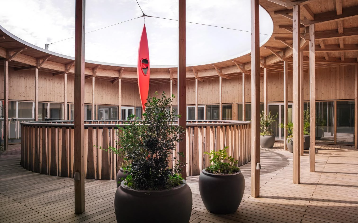 Clad in wood, the new horizontal construction engages in dialogue with the historical Burghölzli Psychiatric Hospital in front, designed by Johann Caspar Wolff in 1869. Its longitudinal facades are curved, forming a concave geometry. The interior, organized around circular and rectangular courtyards, functions like a city. Each of the three levels has a main avenue and secondary streets, alleys, and squares. The more peaceful top floor is reserved for confined patients. A series of wooden huts contains 114 rooms.