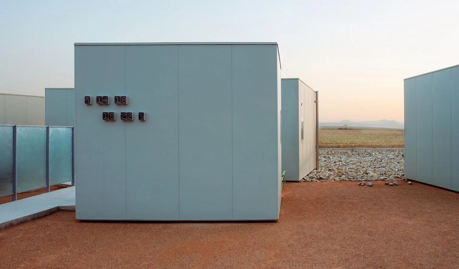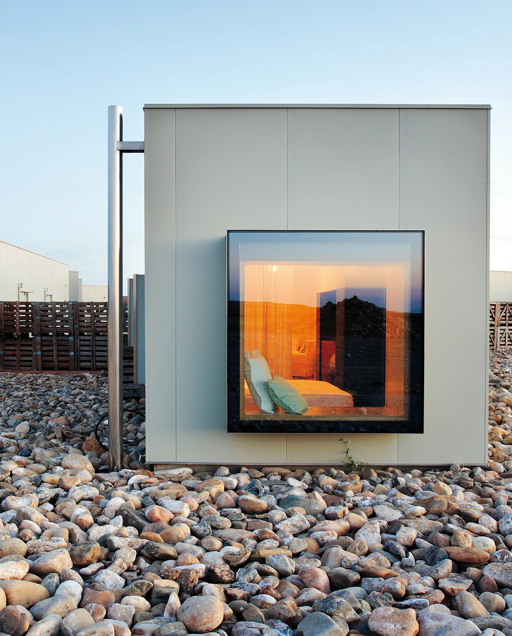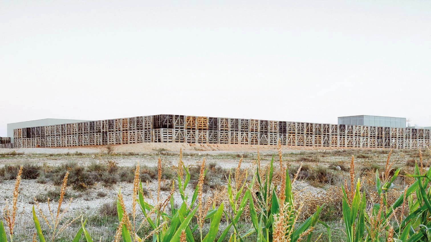 The building’s structure is made out of steel following a dry construction system, except for the concrete slabs. Due to the limited construction time and budget, the facades are built as sandwich panels. The hotel hence asserts its presence as a light piece that can be dismantled and recycled, recalling the local agricultural buildings: the main facade is formed by fruit and vegetable containers, used as enclosures and windbreakers for the outdoor spaces. They stop the wind but let the air pass, need no foundations or fixings, are easy to move and cheap. Like the noble buildings of La Ribera, the piece is organized around a central patio; formed by a series orthogonal structures, this space gives its back to the wind and opens up to the southeast, where a plantation of poplar trees and a pool are located. The hotel consists of a series of simple, monochrome and cubic structures. Their scattered position allows views of the interstitial spaces, minimizing a massive appearance and generating a play of light and shadows. Through an orderly plantation of cherry trees one accesses the hotel’s main body, which houses the common areas – reception, main hall, meeting room, restaurant and bar – and ten rooms with their own patio and fruit tree. The other rooms are freestanding pavilions with large windows overlooking the open landscape, and are accessed through an exterior path that provides them with a private and privileged character, being as they are right out on the wheat fields.