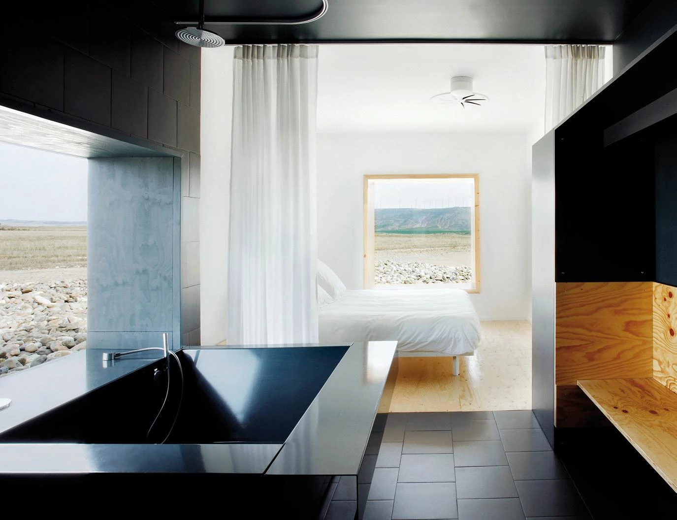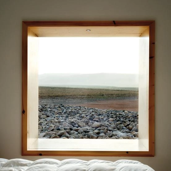 The architecture, interior spaces and landscape design seek to bring the dweller close to the rural and austere character of the surroundings by providing simple, generous and silent spaces. To stress the idea of the rooms as protected outdoor-viewing devices, the windows jut outcreating deep sills that are lined with plywood, concealing frames and curtains. The windows become snug places to read, watch television or contemplate the views, performing also as seating or as an extra bed. The orientation is mainly northeast to allow seeing the illuminated landscape without receiving direct sunlight.