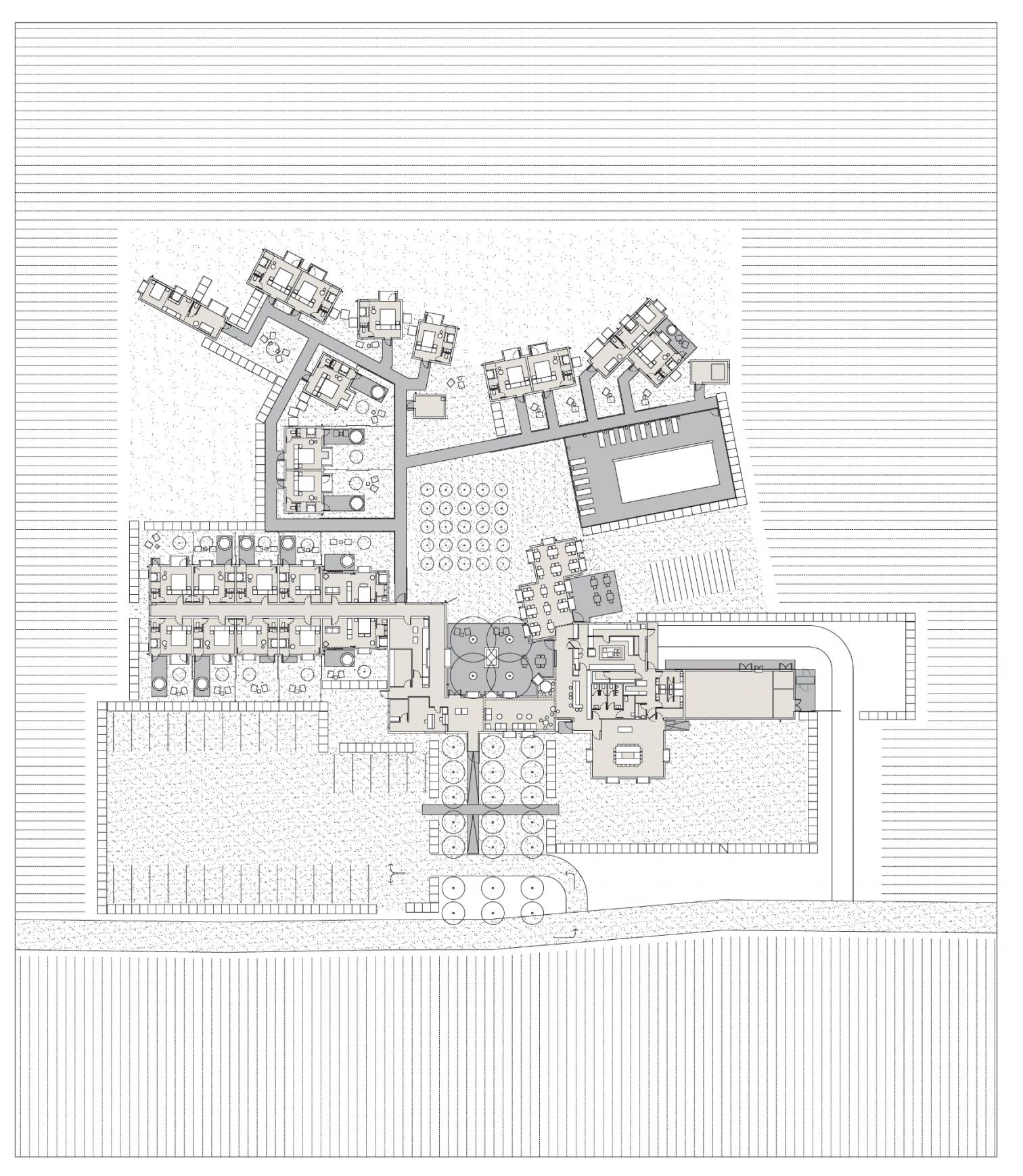 The series of cubic, monochrome and scattered volumes that make up the hotel allow views of the interstitial spaces, avoiding a massive appearance and generating an animated play of light and shadows.