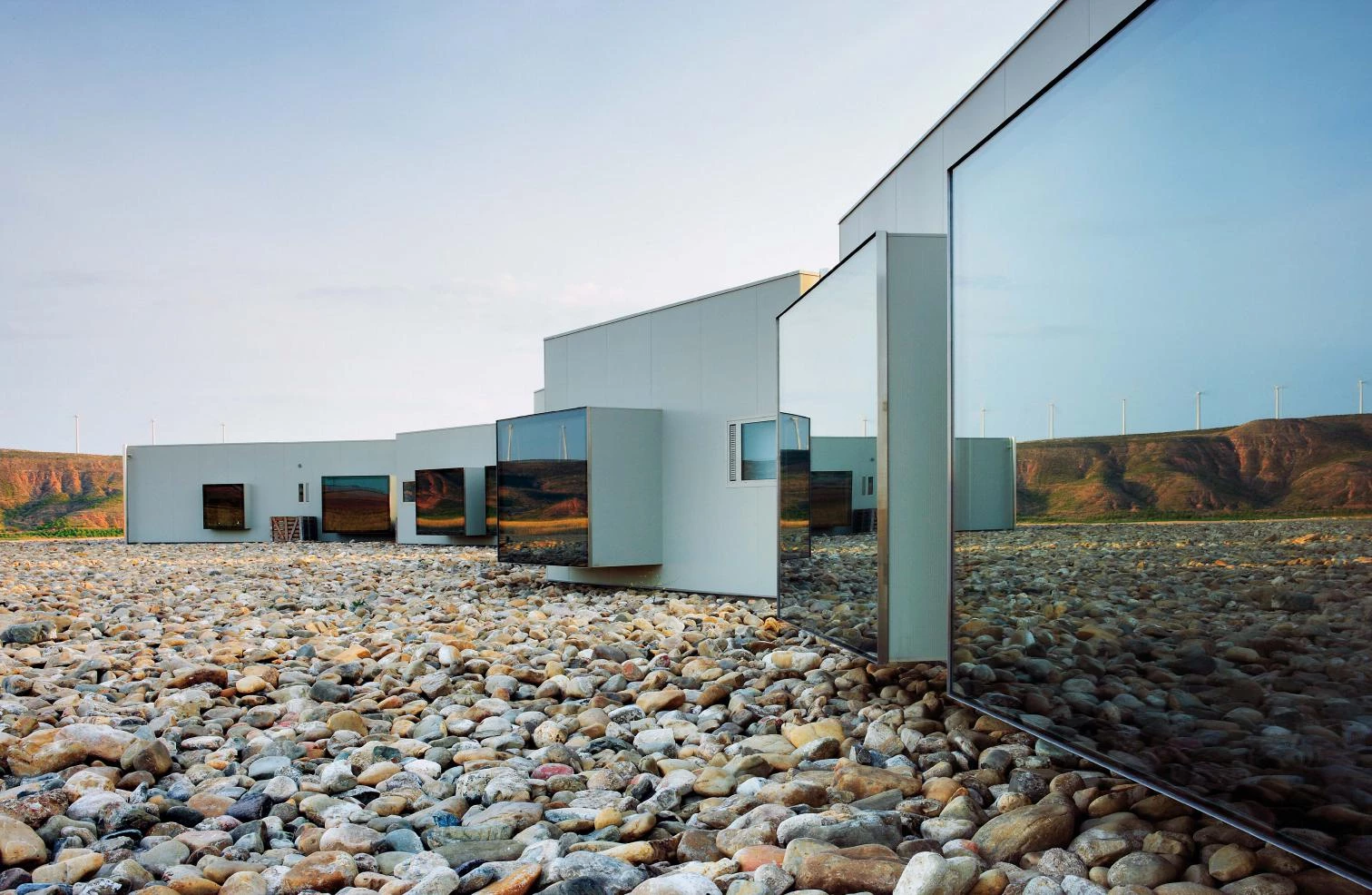 Located three kilometers from Tudela, next to the Bardenas Reales natural park, in a spectacular landscape characterized by the exposure to the strong northeast wind, the hotel is conceived as a sequence of cozy, sheltered interior spaces to contemplate the exterior. Developed on one level, it has twenty-two bedrooms, thirteen of which with private garden.