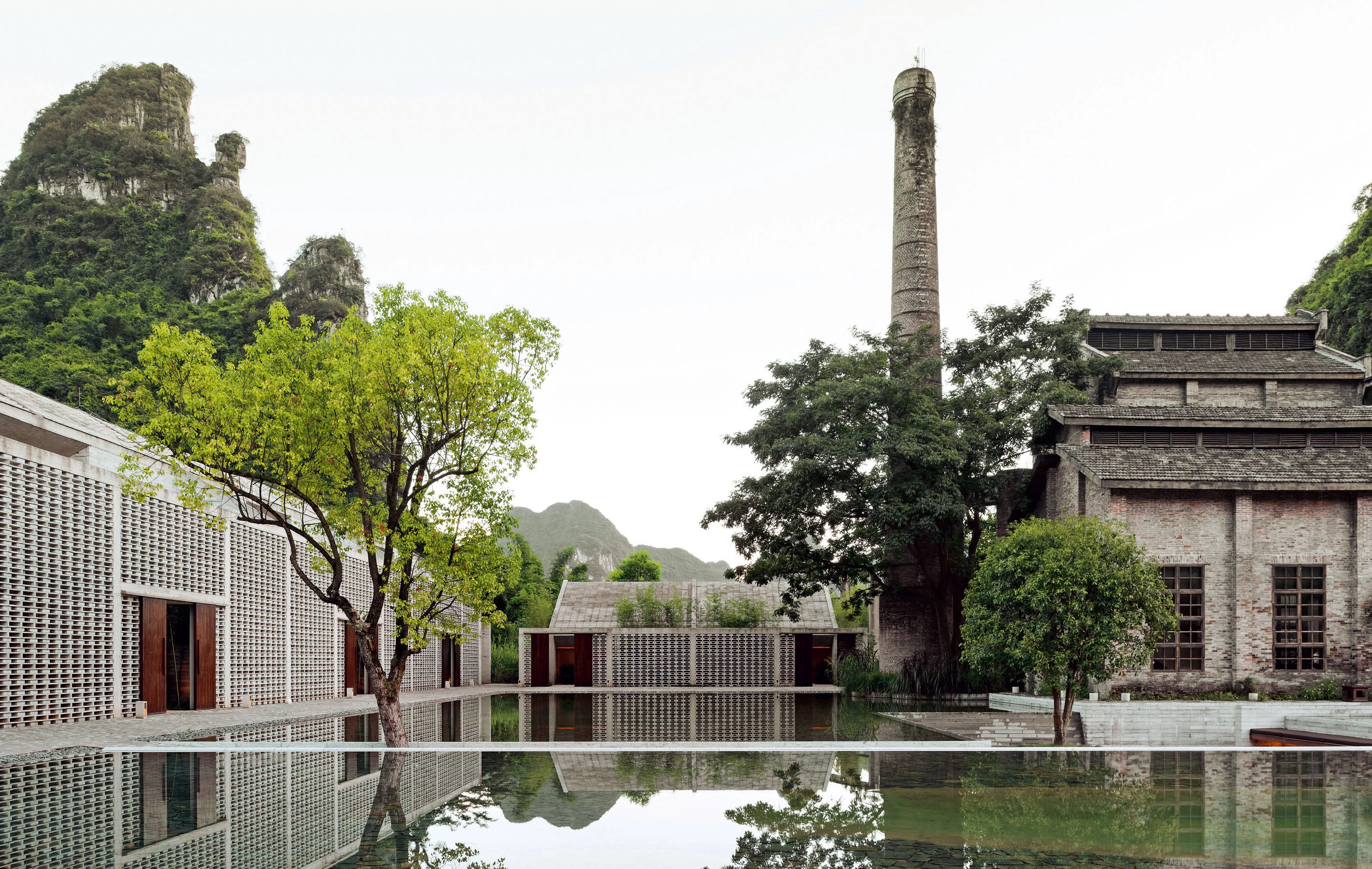 The hotel sits in the picturesque Li River valley of Yangshuo, surrounded by the region’s characteristic karst mountain scenery. In this unique context, the project intervenes on an old sugar mill built in the 1960s, which had been beautifully preserved. This industrial heritage represents the spirit of older generations, and respecting it becomes guiding the premise of this project. The mill and the rest of the old industrial pieces occupy the central part of the hotel complex, flanked by the newly added suite building and villas. The sunken plaza and reflective pond accentuate the spiritual symbolism and significance of the old structure. The design seeks a sense of consistency by using more contemporary materials and construction methods while preserving the tinge and masonry structure of the old. Hollow concrete blocks and wood-formed cast-in-place concrete serves to make the new volume lighter and more transparent. Two circulation systems pass up and through the suite building: one being a completely functional corridor system with the other serving as a free public walkway. The contrast between the horizontality of the architecture and the verticality of the karst mountains suggests an interaction between the artificial and the natural
