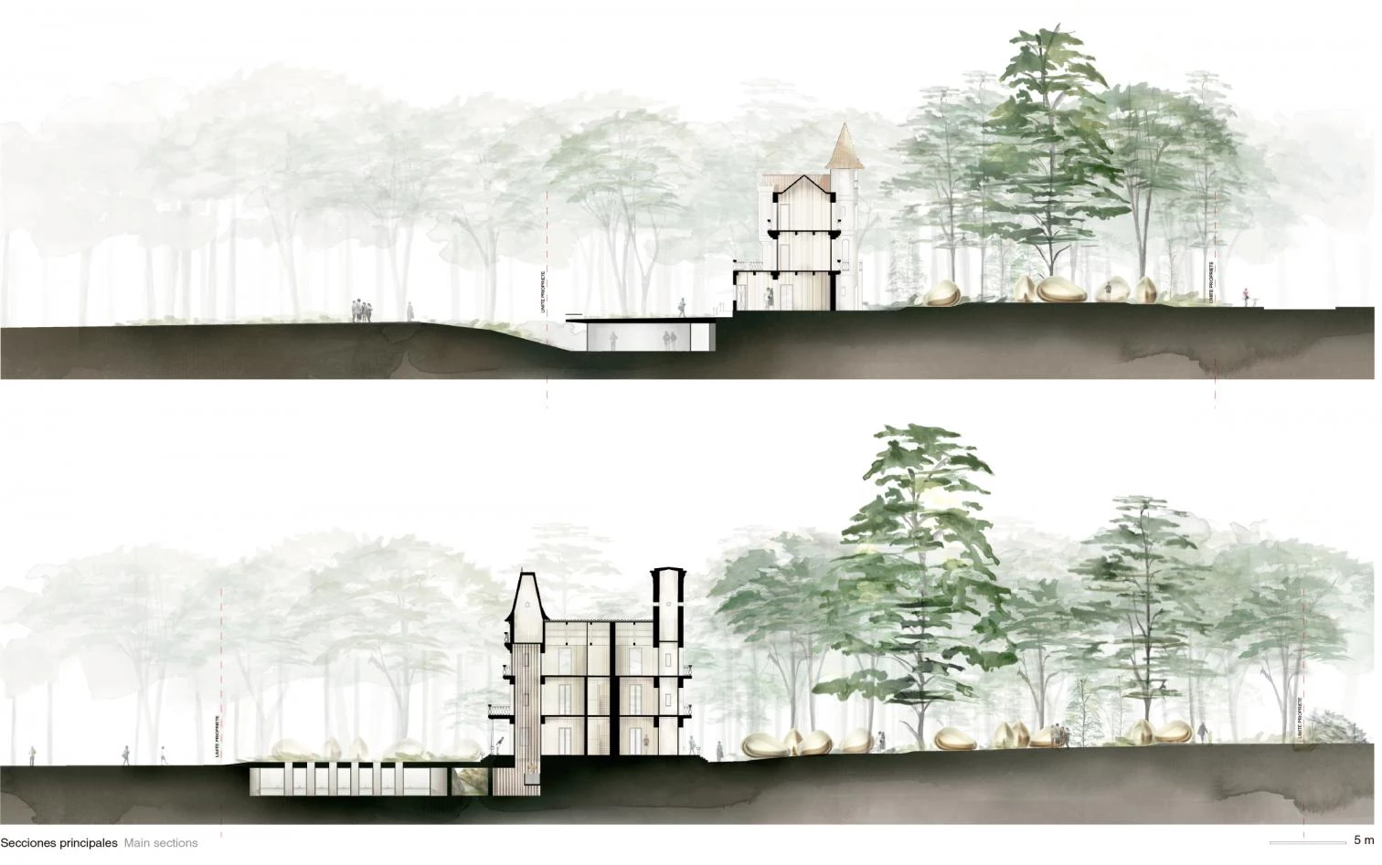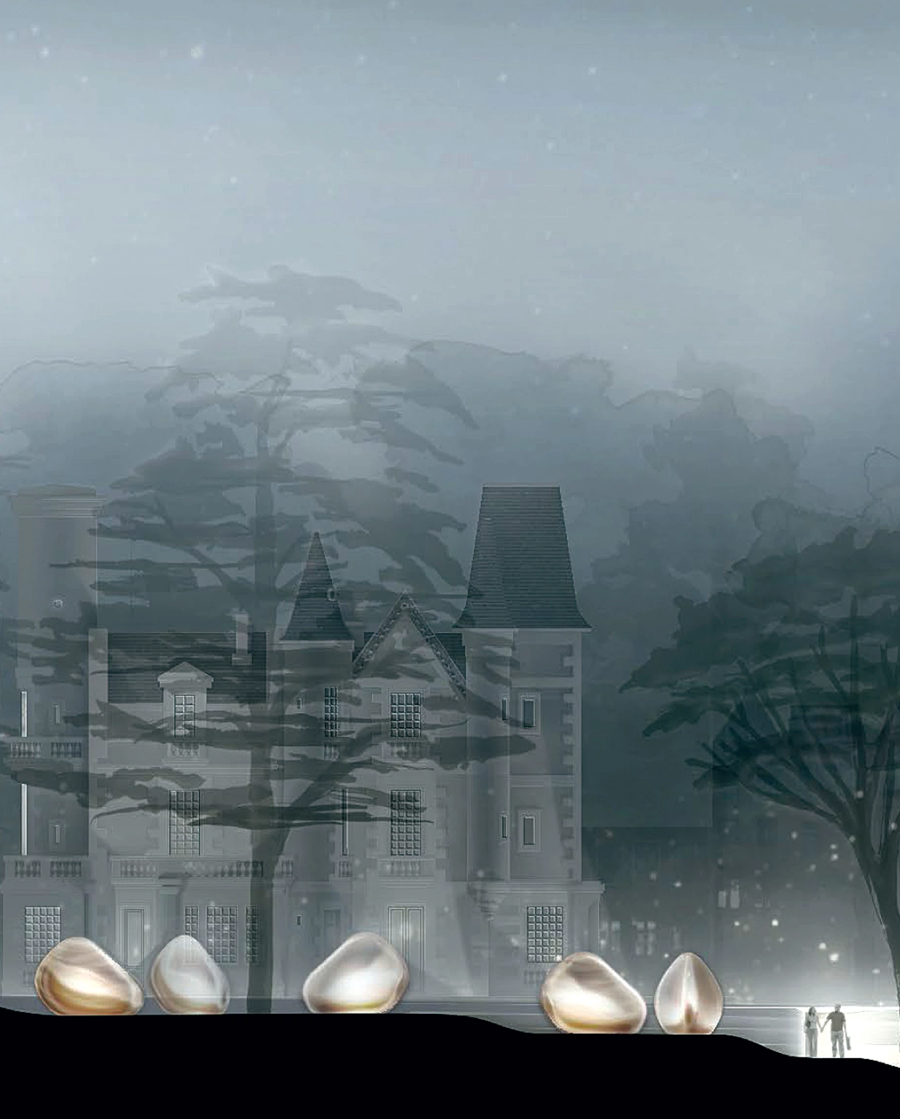 Located in Lormont, in the metropolitan area of Bordeaux, the estate where this project goes up includes a large garden with tall trees and the Bois Fleuri manor house, a structure in the style of the small châteaux dotting the French countryside. The project suggests renewing the area by transforming it into a hotel with one hundred beds to offer a different type of accomodation for the young. The garden’s beauty encouraged to distribute the rooms over its grounds, imitating the experience of sleeping in small shelters in the woods. To achieve this, a prototype of habitational unit was developed, evoking a small chrysalis and offering temporary accommodation with minimal installations and a low impact on the environment. These cells are repeated over the park following a topographic structure of organic forms that reduces the garden to a new basement level adhered to the town’s housing. The buried level communicates the old construction and the rooms, so it contains the communal areas for hotel users. The small dwelling cells, translucid, are invaded by the park atmosphere during the day, while in the evening they illuminate, like fireflies, the night landscape of the grove.