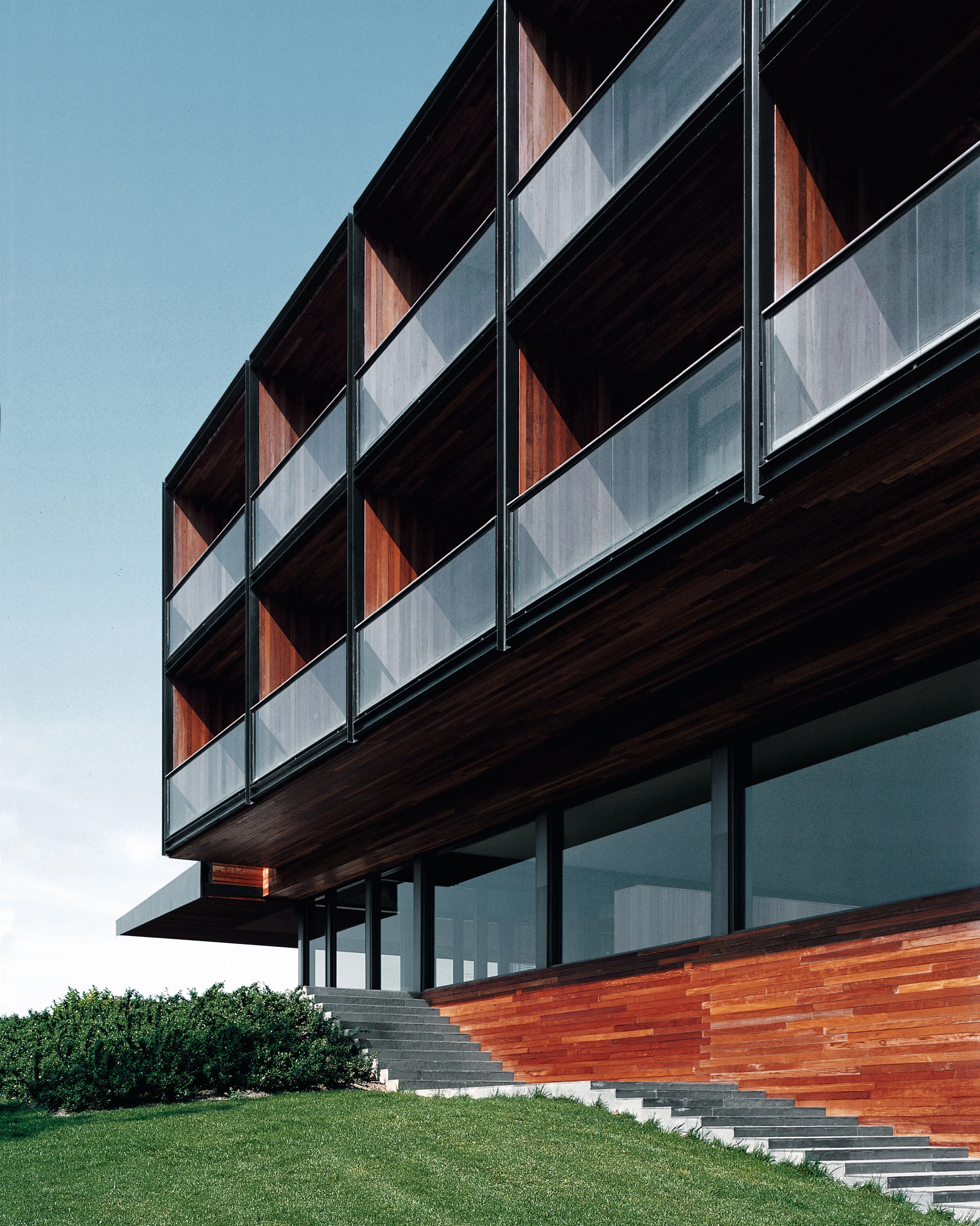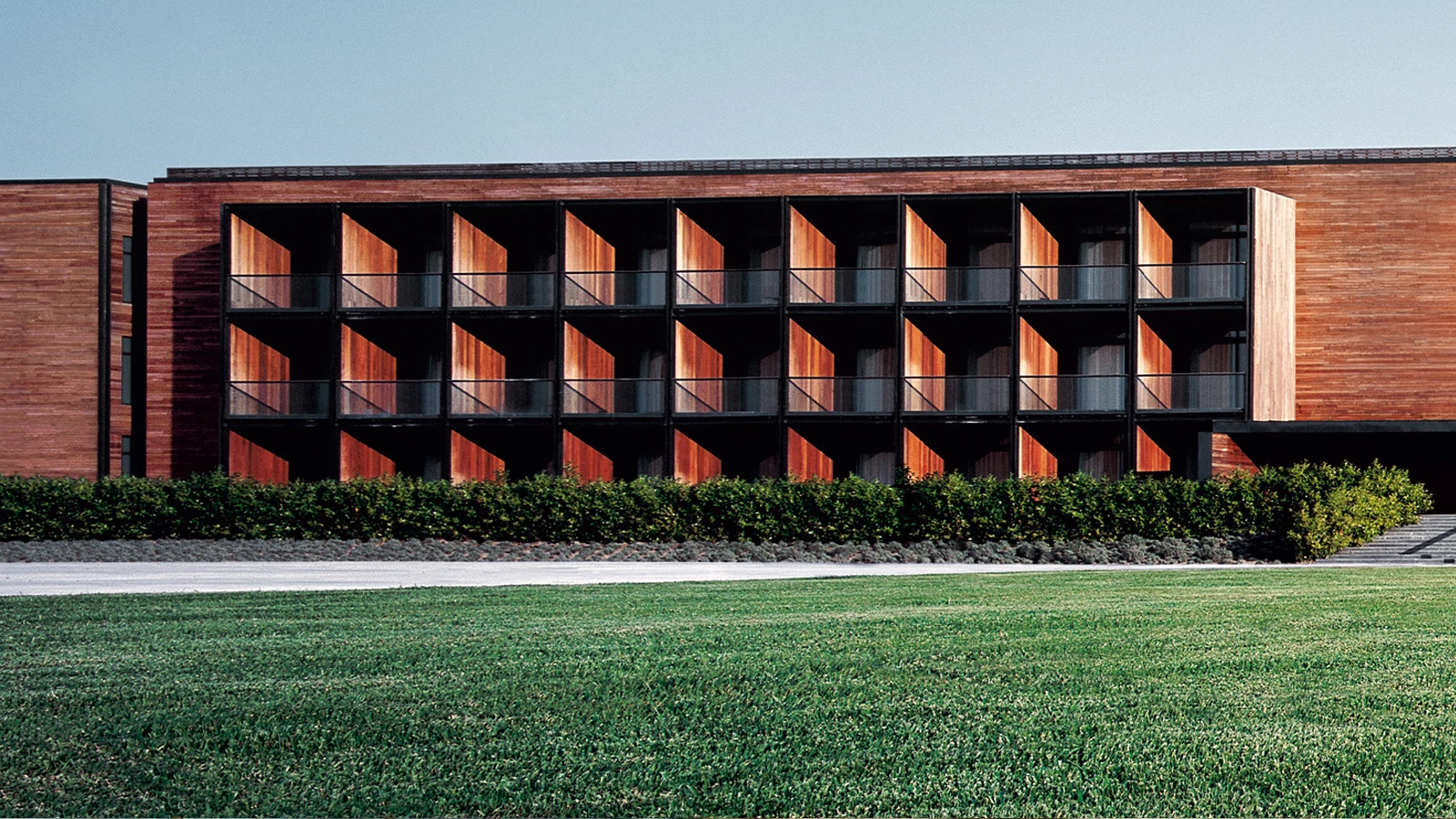 The material used to cover the facades gives them uniformity and coherence, choosing a cladding of Ipe wood boards that have undergone an autoclave treatment that makes their tones vary. The glass surfaces of the rooms are framed with marine wood boards that configure the balconies that jut out from the facade surfaces, generating a gridded modulation that structures their composition and gives the volume a certain emphasis thanks to the interplay of light and dark tones. The masses of shadows are underscored by the large canopy of the west facade, covering the entrance.