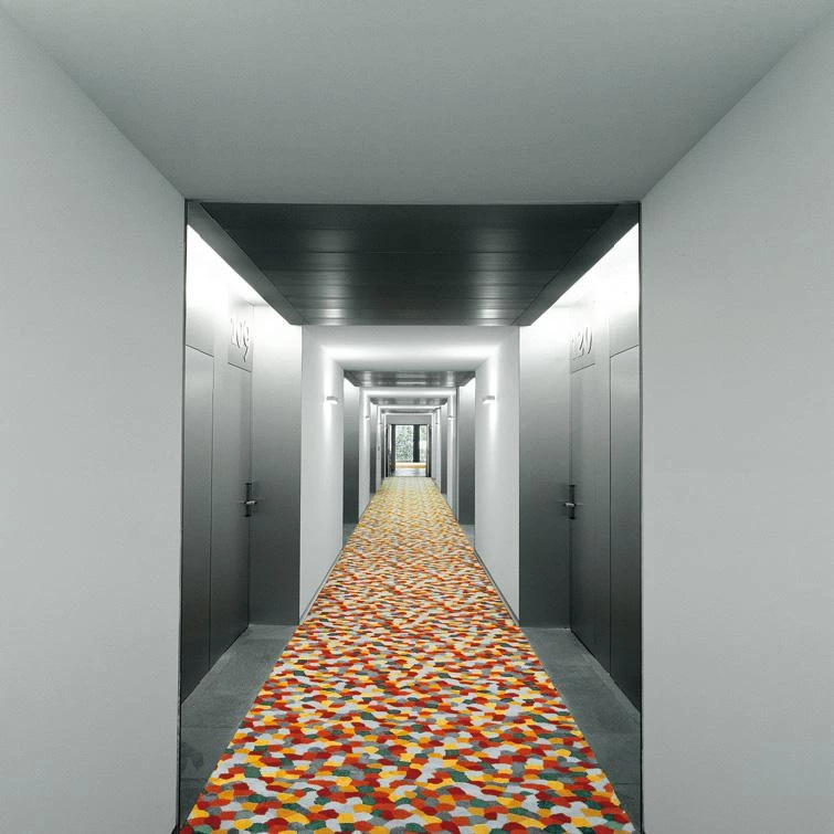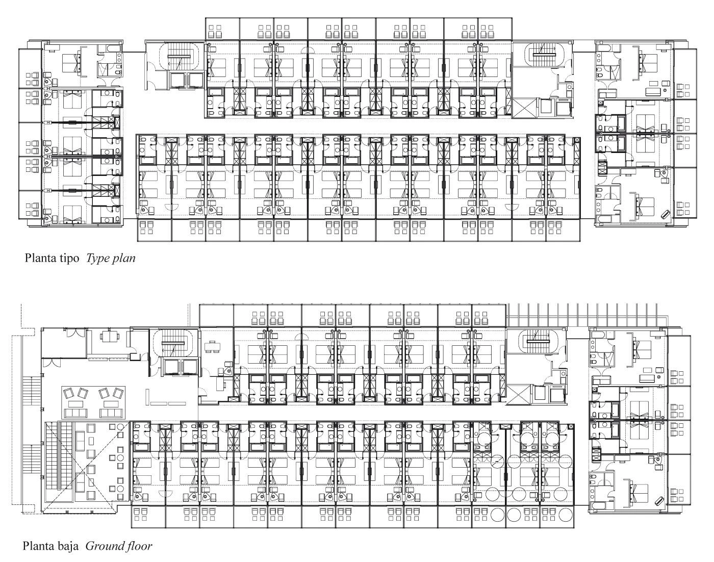 Furthermore, the service areas, kitchens and storage are taken to the other end; connected with the parking zone, these spaces receive natural light and ventilation through a courtyard. The floors containing the eighty rooms and seven suites are organized horizontally following an H-shaped plan, grouping the vertical communication cores and breaking the continuity of the corridors by stretching them to the facade surface to open up entries of light that mark their rhythm.