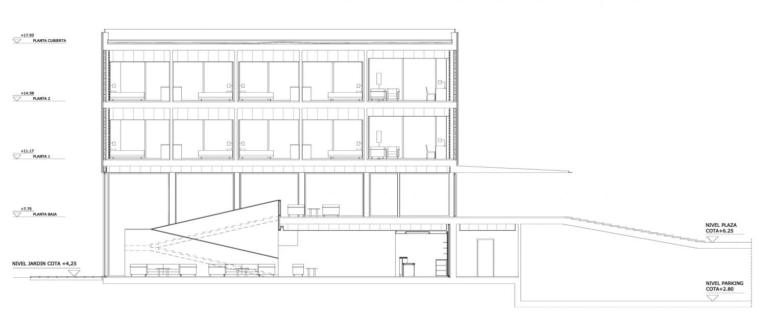The layout is simple, clearly organizing the itineraries and the accesses to the building, making the volume as compact as possible in order to let it rise three stories in the higher area of the plot and adding a fourth one in the lower area. This level accommodates the main entrance through a square that concentrates the more public spaces: the cafeteria, the dining room, the living rooms and the multipurpose halls.